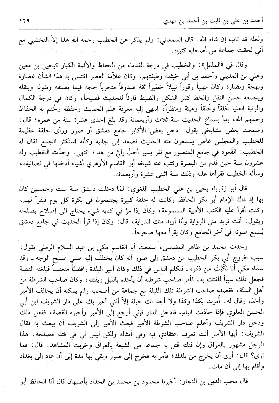 وَلَعَلَّه قد تَابَ إِن شَاءَ الله قَالَ السَّمْعَانِيّ وَلم يذكر عَن الْخَطِيب رَحمَه الله هَذَا إِلَّا النخشبي مَعَ أَنِّي لحقت جمَاعَة من أَصْحَابه كَثِيرَة وَقَالَ فِي المذيل والخطيب فِي دَرَجَة القدماء من الْحفاظ وَالْأَئِمَّة الْكِبَار كيحيى بن معِين وَعلي بن الْمَدِينِيّ وَأحمد بن أبي خَيْثَمَة وطبقتهم وَكَانَ عَلامَة الْعَصْر اكتسى بِهِ هَذَا الشَّأْن غضارة وبهجة ونضارة وَكَانَ مهيباً وقوراً نبيلاً خطيراً ثِقَة صَدُوقًا متحرياً حجَّة فِيمَا يصنفه ويقوله وينقله ويجمعه حسن النَّقْل والخط كثير الشكل والضبط قَارِئًا للْحَدِيث فصيحاً وَكن فِي دَرَجَة الْكَمَال والرتبة الْعليا خلقا وخلقاً وهيئة ومنظراً انْتهى إِلَيْهِ معرفَة علم الحَدِيث وَحفظه وَختم بِهِ الْحفاظ رَحِمهم الله بَدَأَ بِسَمَاع الحَدِيث سنة ثَلَاث وَأَرْبع مائَة وَقد بلغ إِحْدَى عشرَة سنة من عمره قَالَ وَسمعت بعض مشايخي يَقُول دخل بعض الأكابر جَامع دمشق أَو صور وَرَأى حَلقَة عَظِيمَة للخطيب والمجلس غاص يسمعُونَ مِنْهُ الحَدِيث فَصَعدَ إِلَى جَانِبه وَكَأَنَّهُ استكثر الْجمع فَقَالَ لَهُ الْخَطِيب الْقعُود فِي جَامع الْمَنْصُور مَعَ نفر يسير أحب إِلَيّ من هَذَا انْتهى وَحدث الْخَطِيب وَله عشرُون سنة حِين قدم من الْبَصْرَة وَكتب عَنهُ شَيْخه أَبُو الْقَاسِم الْأَزْهَرِي أَشْيَاء أدخلها فِي تصانيفه وَسَأَلَهُ الْخَطِيب فقرأها عَلَيْهِ وَذَلِكَ سنة اثْنَتَيْ عشرَة وَأَرْبع مائَة قَالَ أَبُو زَكَرِيَّاء يحيى بن عَليّ الْخَطِيب اللّغَوِيّ لما دخلت دمشق سنة سِتّ وَخمسين كَانَ بهَا إِذْ ذَاك الإِمَام أَبُو بكر الْحَافِظ وَكَانَت لَهُ حَلقَة كَبِيرَة يَجْتَمعُونَ فِي بكرَة كل يَوْم فَيقْرَأ لَهُم وَكنت أَقرَأ عَلَيْهِ الْكتب الأدبية المسموعة وَكَانَ إِذا مر فِي كِتَابه شَيْء يحْتَاج إِلَى إصْلَاح يصلحه وَيَقُول أَنْت مني الرِّوَايَة وَأَنا أُرِيد مِنْك الدِّرَايَة قَالَ وَكَانَ إِذا قَرَأَ الحَدِيث فِي جَامع دمشق يسمع صَوته فِي آخر الْجَامِع وَكَانَ يقْرَأ مَعهَا صَحِيحا)