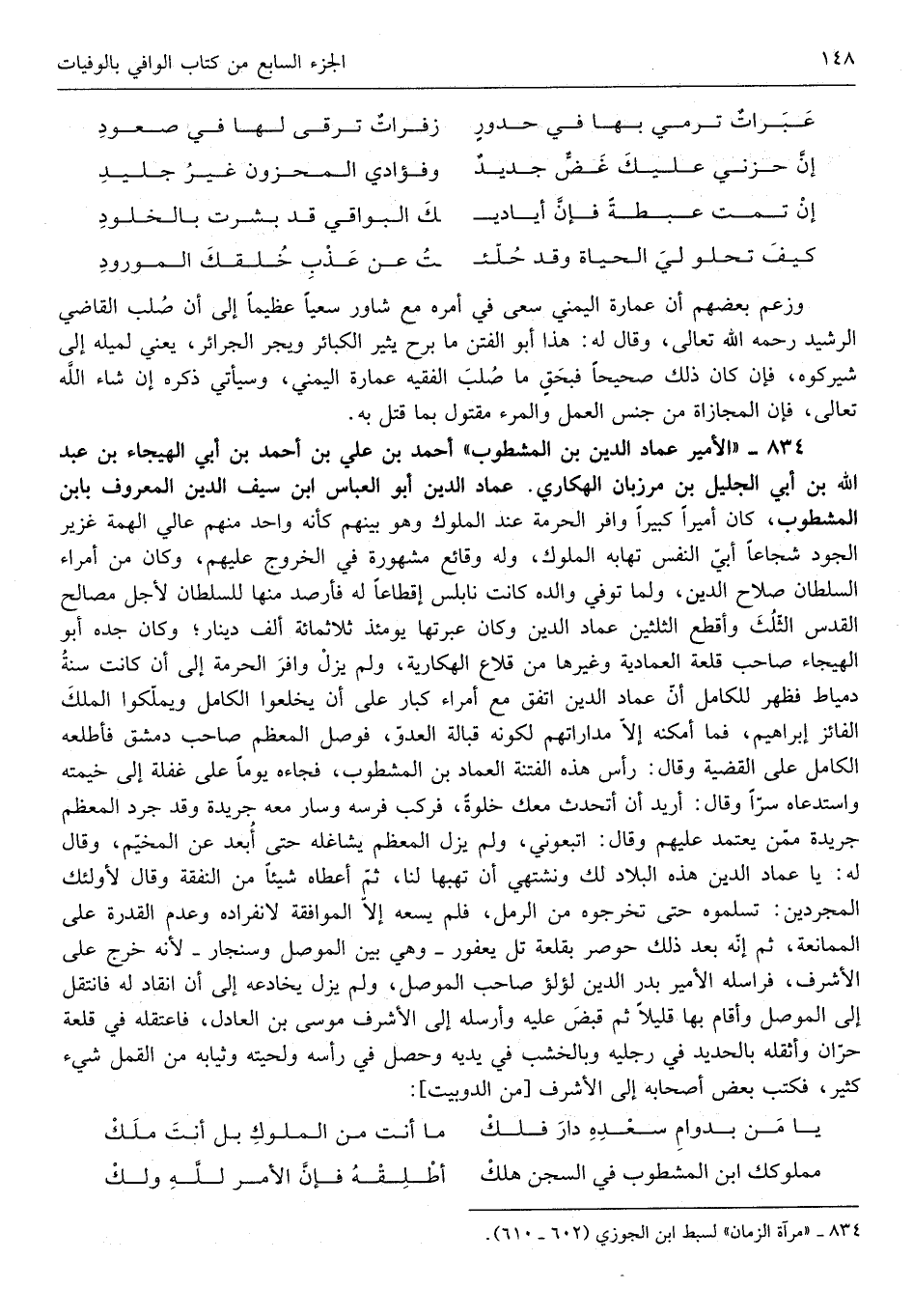 أَحْمد بن عَليّ بن أَحْمد بن أبي الهيجاء بن عبد الله بن أبي الْجَلِيل ابْن مرزبان الهكاري عماد الدّين أَبُو الْعَبَّاس بن سيف الدّين الْمَعْرُوف بِابْن المشطوب كَانَ أَمِيرا كَبِيرا وافر الْحُرْمَة عِنْد)