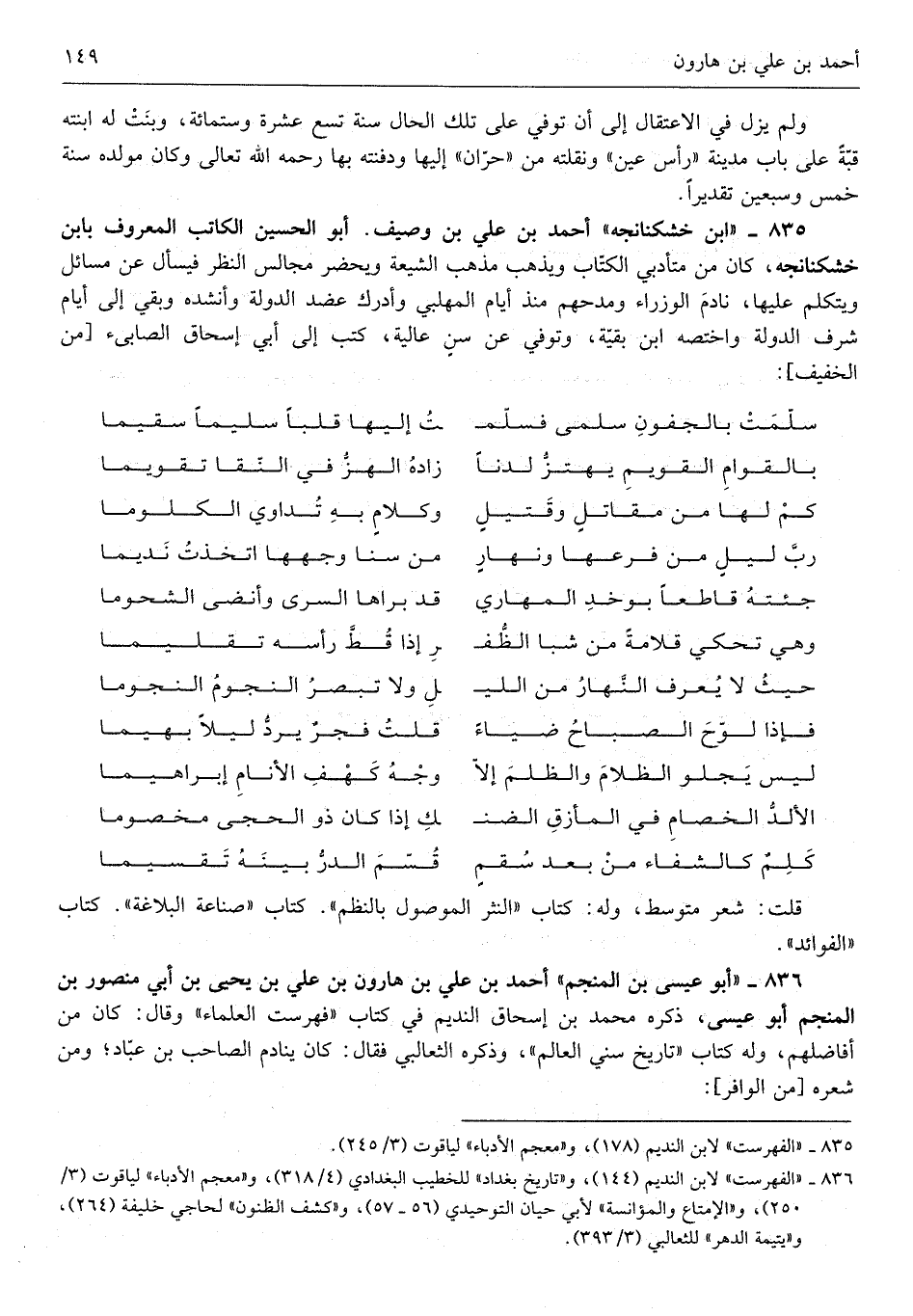 أَحْمد بن عَليّ بن وصيف أَبُو الْحُسَيْن الْكَاتِب الْمَعْرُوف بِابْن خشكنانجه كَانَ من متأدبي الْكتاب وَيذْهب مَذْهَب الشِّيعَة ويحضر مجَالِس النّظر فَيسْأَل عَن مسَائِل وَيتَكَلَّم عَلَيْهَا نادم)