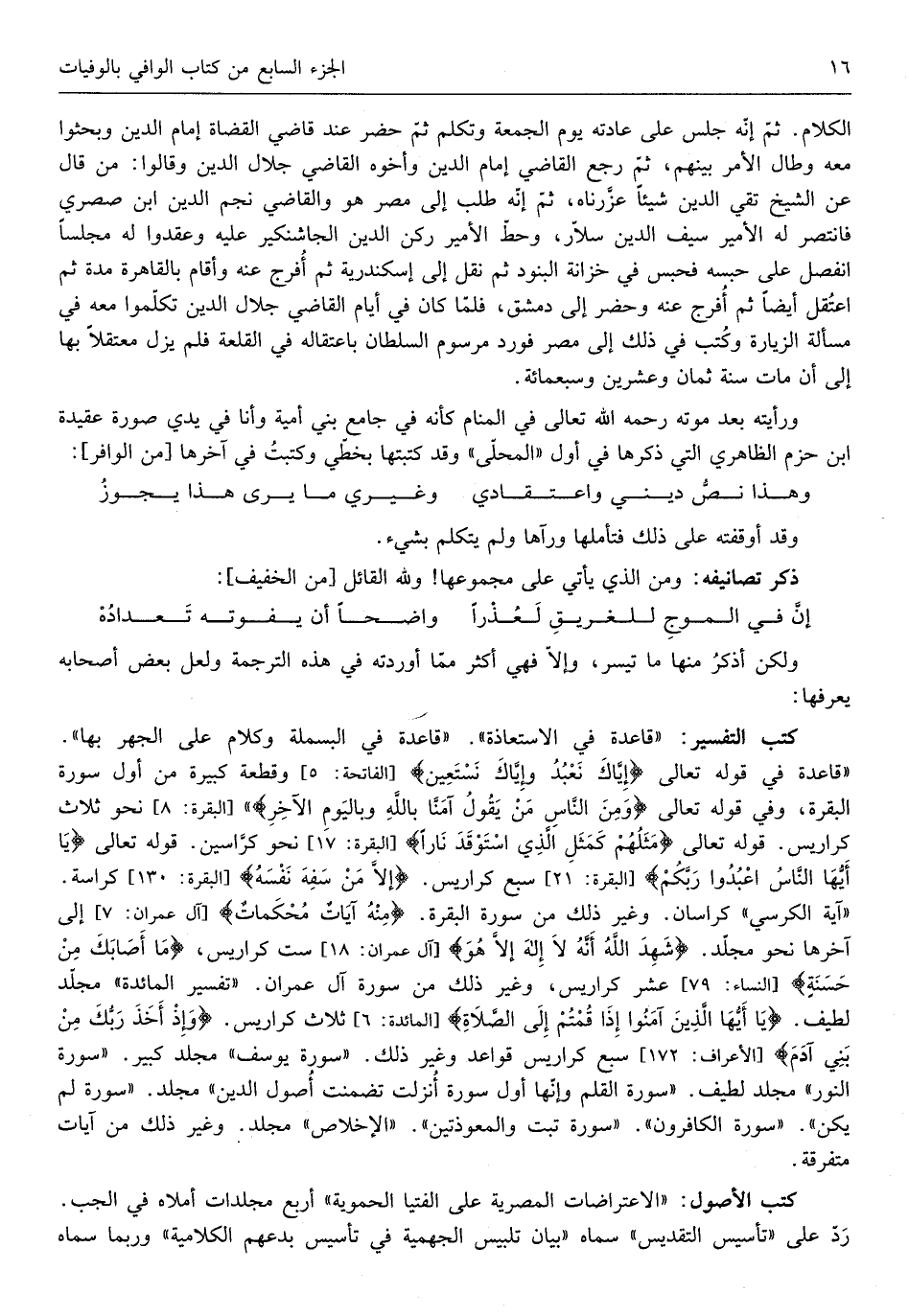 وَلَكِن أذكر مِنْهَا مَا تيَسّر وَإِلَّا فَهِيَ أَكثر مِمَّا أوردته فِي هَذِه التَّرْجَمَة وَلَعَلَّ بعض أَصْحَابه يعرفهَا كتب التَّفْسِير قَاعِدَة فِي الِاسْتِعَاذَة قَاعِدَة فِي الْبَسْمَلَة وَكَلَام على الْجَهْر بهَا قَاعِدَة فِي قَوْله تَعَالَى إياك نعْبد وَإِيَّاك نستعين وَقطعَة كَبِيرَة من أول سُورَة الْبَقَرَة وَفِي قَوْله تَعَالَى وَمن النَّاس من يَقُول آمنا بِاللَّه وباليوم الآخر نَحْو ثَلَاث كراريس قَوْله تَعَالَى مثلهم كَمثل الَّذِي استوقد نَارا نَحْو كراسين يَا أَيهَا النَّاس اعبدوا ربكُم سبع كراريس إِلَّا من سفه نَفسه كراسة آيَة الْكُرْسِيّ كراسان وَغير ذَلِك من سُورَة الْبَقَرَة مِنْهُ آيَات محكمات إِلَى آخرهَا نَحْو مجلّد شهد الله أَنه لَا إِلَه إِلَّا هُوَ سِتّ كراريس مَا أَصَابَك من حسنةٍ عشر كراريس وَغير ذَلِك من سُورَة آل عمرَان تَفْسِير الْمَائِدَة مُجَلد لطيف يَا أَيهَا الَّذين آمنُوا إِذا قُمْتُم إِلَى الصَّلَاة ثَلَاث كراريس وَإِذ أَخذ رَبك من بني آدم سبع كراريس قَوَاعِد وَغير ذَلِك سُورَة يُوسُف مُجَلد كَبِير سُورَة النُّور مُجَلد لطيف سُورَة الْقَلَم وَأَنَّهَا أول سُورَة أنزلت تَضَمَّنت أصُول الدّين مُجَلد سُورَة لم يكن سُورَة الْكَافِرُونَ سُورَة تبت والمعوذتين الْإِخْلَاص مُجَلد وَغير ذَلِك من آيَات مُتَفَرِّقَة