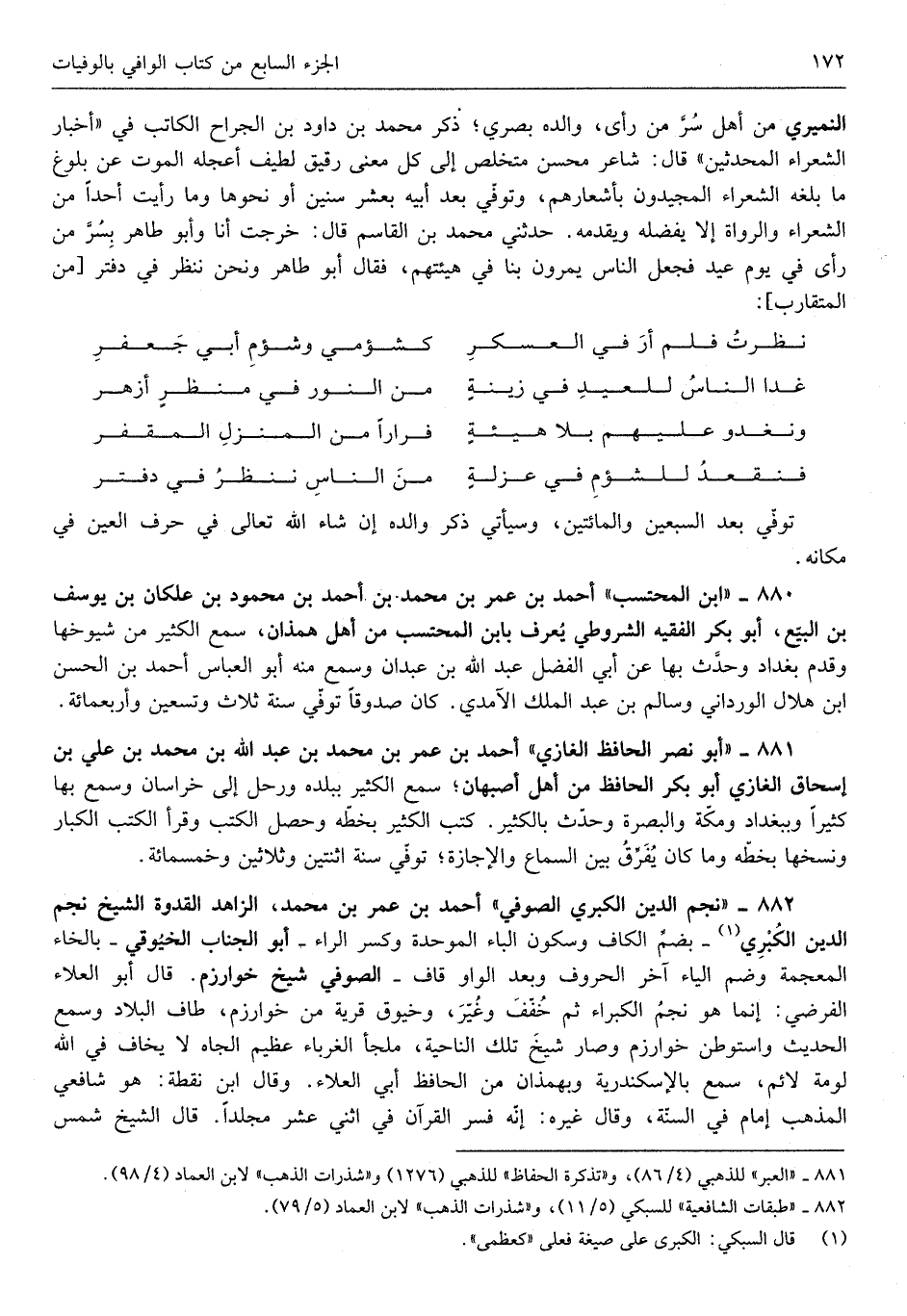 أَحْمد بن عمر بن مُحَمَّد الزَّاهِد الْقدْوَة الشَّيْخ نجم الدّين الكبري بِضَم الْكَاف وَسُكُون الْبَاء الْمُوَحدَة وَكسر الرَّاء أَبُو الجناب الخيوقي بِالْخَاءِ الْمُعْجَمَة وَضم الْيَاء آخر الْحُرُوف وَبعد الْوَاو قَاف الصُّوفِي شيخ خوارزم قَالَ أَبُو الْعَلَاء الفرضي إِنَّمَا هُوَ نجم الكبراء ثمَّ خفف وَغير وخيوق قَرْيَة من خوارزم طَاف الْبِلَاد وَسمع الحَدِيث واستوطن خوارزم وَصَارَ شيخ تِلْكَ النَّاحِيَة ملْجأ الغرباء عَظِيم الجاه لَا يخَاف فِي الله لومة لائم سمع بالإسكندرية وبهمذان من الْحَافِظ أبي الْعَلَاء وَقَالَ ابْن نقطة هُوَ شَافِعِيّ الْمَذْهَب إِمَام فِي السّنة وَقَالَ غَيره إِنَّه فسر الْقُرْآن فِي اثْنَي عشر مجلداً قَالَ الشَّيْخ شمس