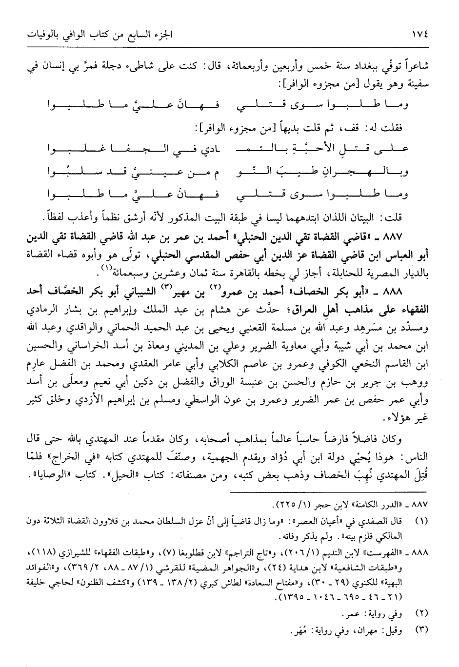 أَحْمد بن عَمْرو بن مهير الشَّيْبَانِيّ أَبُو بكر الْخصاف أحد الْفُقَهَاء على مَذَاهِب أهل الْعرَاق حدث عَن هِشَام بن عبد الْملك وَإِبْرَاهِيم بن بشار الرَّمَادِي ومسدد بن مسرهد وَعبد الله بن مسلمة القعْنبِي وَيحيى بن عبد الحميد الْحمانِي والواقدي وَعبد الله بن مُحَمَّد بن أبي شيبَة وَأبي مُعَاوِيَة الضَّرِير وَعلي بن الْمَدِينِيّ ومعاذ بن أَسد الْخُرَاسَانِي وَالْحُسَيْن بن الْقَاسِم النَّخعِيّ الْكُوفِي وَعَمْرو بن عَاصِم الْكلابِي وَأبي عَامر الْعَقدي وَمُحَمّد بن الْفضل عَارِم ووهب بن جرير بن حَازِم وَالْحسن بن عَنْبَسَة الْوراق وَالْفضل بن دُكَيْن أبي نعيم وَمعلى بن أَسد وَأبي عمر حَفْص بن عمر الضَّرِير وَعَمْرو بن عون الوَاسِطِيّ وَمُسلم بن إِبْرَاهِيم الْأَزْدِيّ وَخلق كثير غير هَؤُلَاءِ وَكَانَ فَاضلا فارضاً حاسباً عَالما بمذاهب أَصْحَابه وَكَانَ مقدما عِنْد الْمُهْتَدي بِاللَّه حَتَّى قَالَ النَّاس هُوَ ذَا يحيى دولة بن أبي دؤاد وَيقدم الْجَهْمِية وصنف للمهتدي كِتَابه)