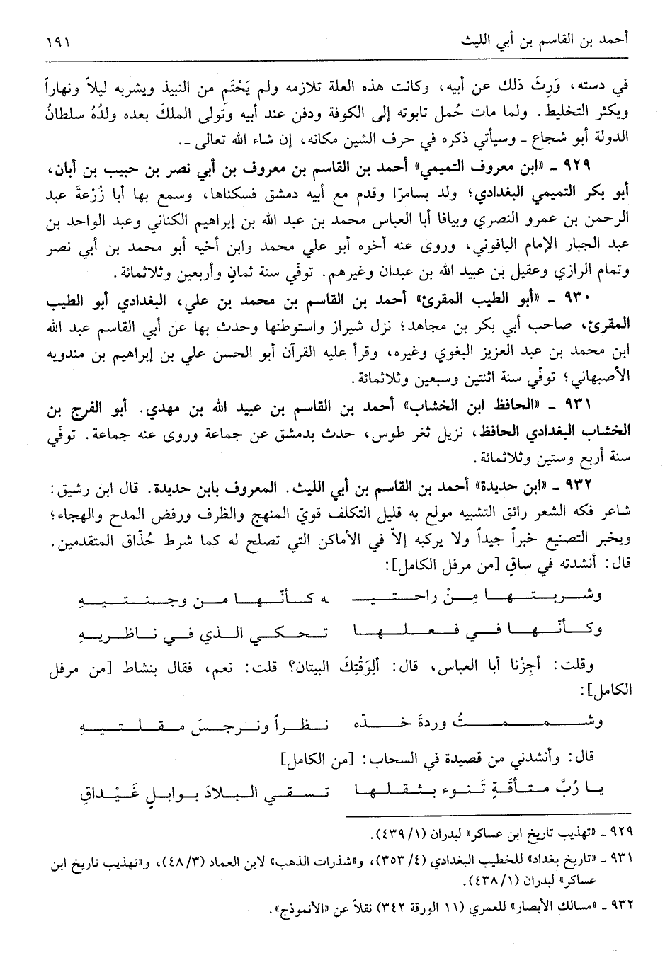 أَحْمد بن الْقَاسِم بن أبي اللَّيْث الْمَعْرُوف بِابْن حَدِيدَة قَالَ ابْن رَشِيق شَاعِر فكه الشّعْر رائق التَّشْبِيه مولع بِهِ قَلِيل التَّكَلُّف قوي الْمنْهَج والظرف ورفض الْمَدْح والهجاء ويخبر التصنيع خَبرا جيدا وَلَا يركبه إِلَّا فِي الْأَمَاكِن الَّتِي تصلح لَهُ كَمَا شَرط حذاق الْمُتَقَدِّمين قَالَ أنشدته فِي سَاق وشربتها من راحتيه كَأَنَّهَا من وجنتيه