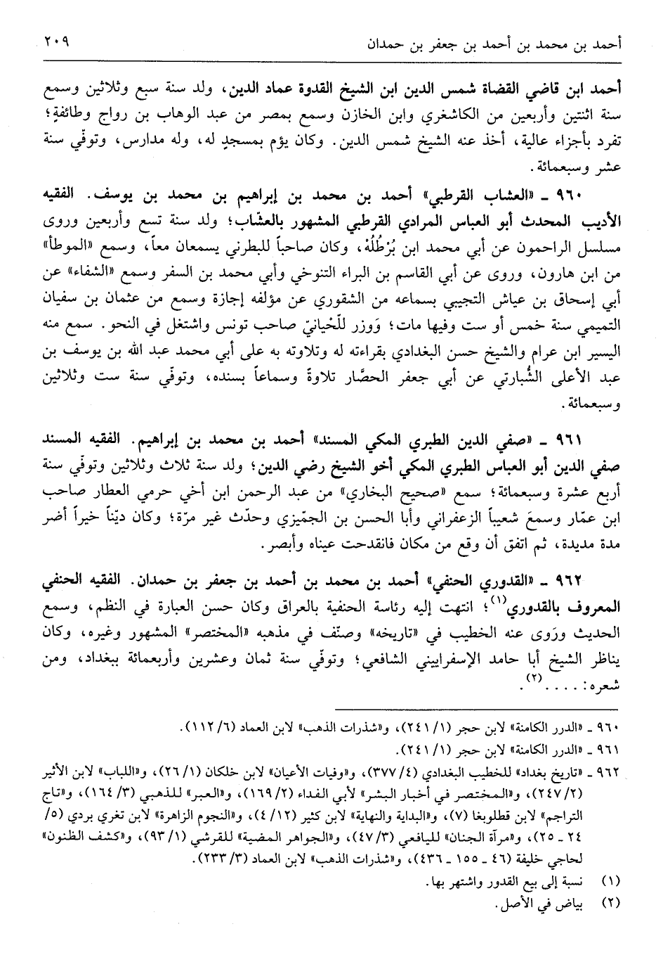 أَحْمد بن مُحَمَّد بن أَحْمد بن جَعْفَر بن حمدَان الْفَقِيه الْحَنَفِيّ الْمَعْرُوف بالقدوري انْتَهَت إِلَيْهِ رئاسة الْحَنَفِيَّة بالعراق وَكَانَ حسن الْعبارَة فِي النّظم وَسمع الحَدِيث وروى عَنهُ الْخَطِيب فِي تَارِيخه وصنف فِي مذْهبه الْمُخْتَصر الْمَشْهُور وَغَيره وَكَانَ يناظر الشَّيْخ أَبَا حَامِد الاسفراييني الشَّافِعِي وَتُوفِّي سنة ثَمَان وَعشْرين وَأَرْبع مائَة ببغداذ وَمن شعره