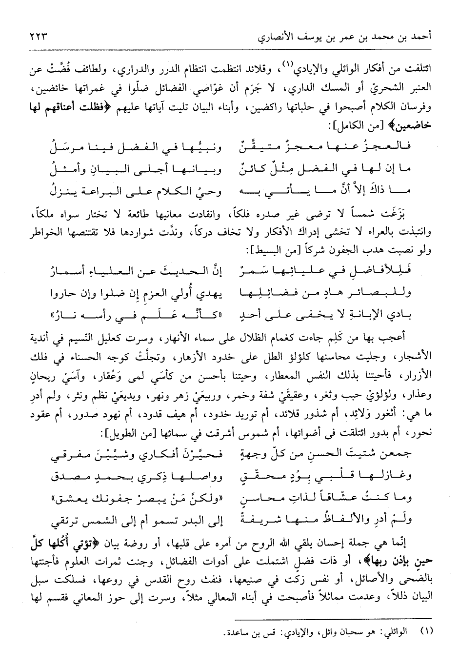 ائتلفت من أفكار الوائلي والإيادي وقلائد انتظمت انتظام الدُّرَر والدراري ولطائف فضّت عَن العنبر الشحريّ أَو الْمسك الدَّارِيّ لَا جرم أَن غوّاصي الْفَضَائِل ضلوا فِي غمراتها خائضين وفرسان الْكَلَام أَصْبحُوا فِي حلباتها راكضين وَأَبْنَاء الْبَيَان تليت آياتها عَلَيْهِم فظلت أَعْنَاقهم لَهَا خاضعين