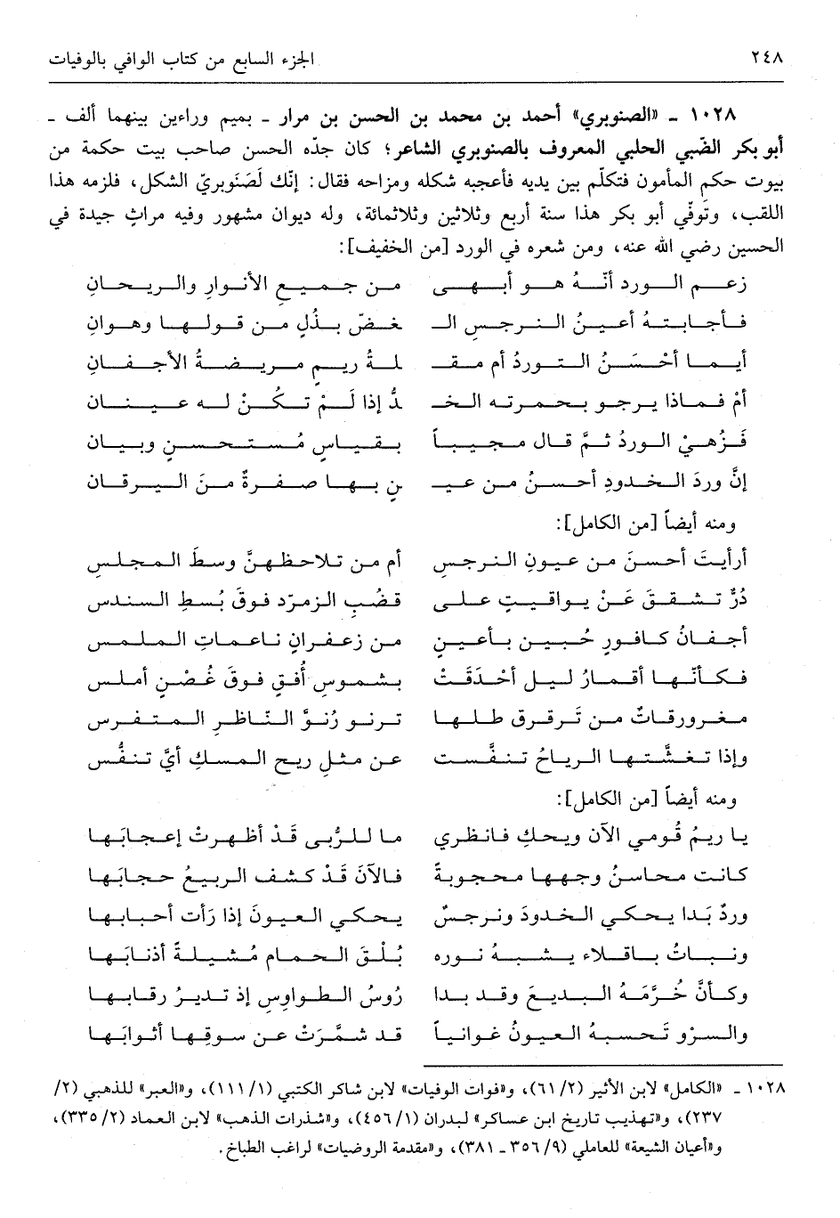 أَحْمد بن مُحَمَّد بن الْحسن بن مرار بميم وراءين بيينهما ألف أَبُو بكر الضَّبِّيّ الْحلَبِي الْمَعْرُوف بالصنوبري الشَّاعِر كَانَ جده الْحسن صابح بَيت حِكْمَة من بيُوت حكم الْمَأْمُون فَتكلم بَين يَدَيْهِ فأعجبه شكله ومزاحه فَقَالَ إِنَّك لصنوبري الشكل فَلَزِمَهُ هَذَا اللقب وَتُوفِّي أَبُو بكر هَذَا سنة أَربع وَثَلَاثِينَ وَثَلَاث مائَة وَله ديوَان مَشْهُور وَفِيه مراثٍ جَيِّدَة فِي الْحُسَيْن رَضِي الله عَنهُ وَمن شعره فِي الْورْد