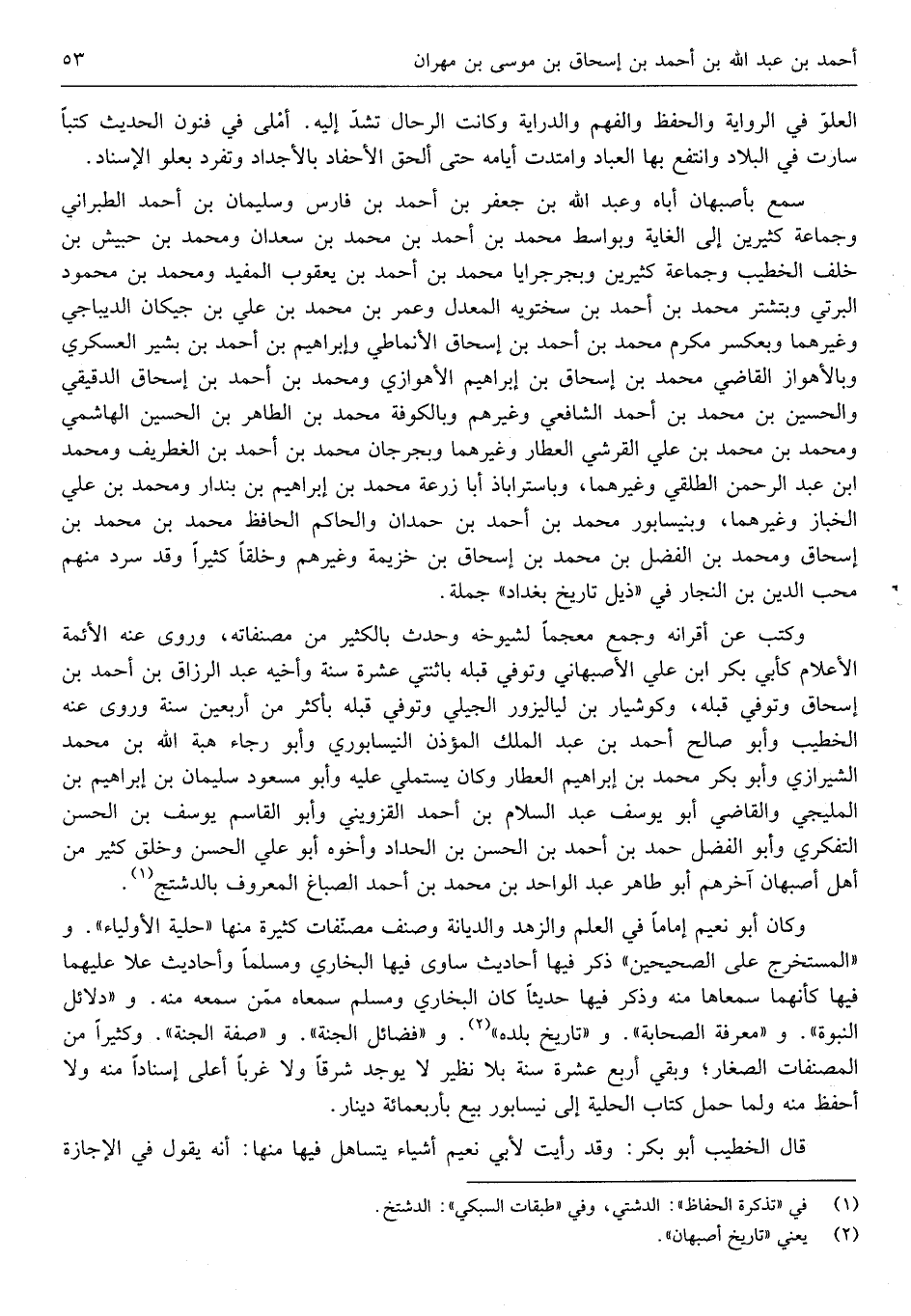 الْعُلُوّ فِي الرِّوَايَة وَالْحِفْظ والفهم والدراية وَكَانَت الرّحال تشد إِلَيْهِ أمْلى فِي فنون الحَدِيث كتبا سَارَتْ فِي الْبِلَاد وانتفع بهَا الْعباد وامتدت أَيَّامه حَتَّى ألحق الأحفاد بالأجداد وَتفرد بعلو الْإِسْنَاد سمع بأصبهان أَبَاهُ وَعبد الله بن جَعْفَر ابْن أَحْمد بن فَارس وَسليمَان بن أَحْمد الطَّبَرَانِيّ وَجَمَاعَة كثيرين إِلَى الْغَايَة وبواسط مُحَمَّد بن أَحْمد بن مُحَمَّد بن سَعْدَان وَمُحَمّد بن حُبَيْش بن خلف الْخَطِيب وَجَمَاعَة كثيرين وبجرجرايا مُحَمَّد بن أَحْمد بن يَعْقُوب الْمُفِيد وَمُحَمّد بن مَحْمُود البرتي وبتشتر مُحَمَّد بن أَحْمد بن سختويه الْمعدل وَعمر بن مُحَمَّد بن عَليّ بن جيكان الديباجي وَغَيرهمَا وبعسكر مكرم مُحَمَّد بن أَحْمد بن إِسْحَاق الْأنمَاطِي وَإِبْرَاهِيم بن أَحْمد بن بشير العسكري وبالأهواز القَاضِي مُحَمَّد بن إِسْحَاق بن إِبْرَاهِيم الْأَهْوَازِي وَمُحَمّد بن أَحْمد بن إِسْحَاق الدقيقي وَالْحُسَيْن بن مُحَمَّد بن أَحْمد الشَّافِعِي وَغَيرهم وبالكوفة مُحَمَّد بن الطَّاهِر بن الْحُسَيْن الْهَاشِمِي وَمُحَمّد بن)