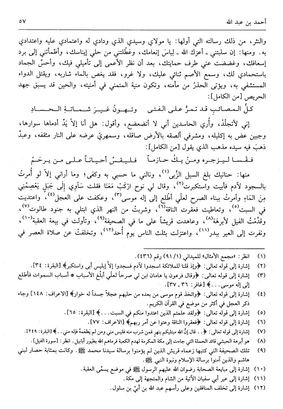 مِنْهَا حنانيك بلغ السَّيْل الزبى ونالني مَا حسبي بِهِ وَكفى وَمَا أَرَانِي إِلَّا لَو أمرت بِالسُّجُود لآدَم فأبيت واستكبرت وَقَالَ لي نوح اركب مَعنا فَقلت سآوي إِلَى جبلٍ يعصمني من المَاء وَأمرت بِبِنَاء الصرح لعَلي أطّلع إِلَى إِلَه مُوسَى وعكفت على الْعجل واعتديت فِي السبت وتعاطيت فعقرت النَّاقة وشربت من النَّهر الَّذِي ابْتُلِيَ بِهِ جنود طالوت وقدّمت الْفِيل لأبرهة وعاهدت قُريْشًا على مَا فِي الصَّحِيفَة وتأولت فِي بيعَة الْعقبَة ونفرت إِلَى العير ببدر واعتزلت بِثلث النَّاس يَوْم أحد وَتَخَلَّفت عَن صَلَاة الْعَصْر فِي