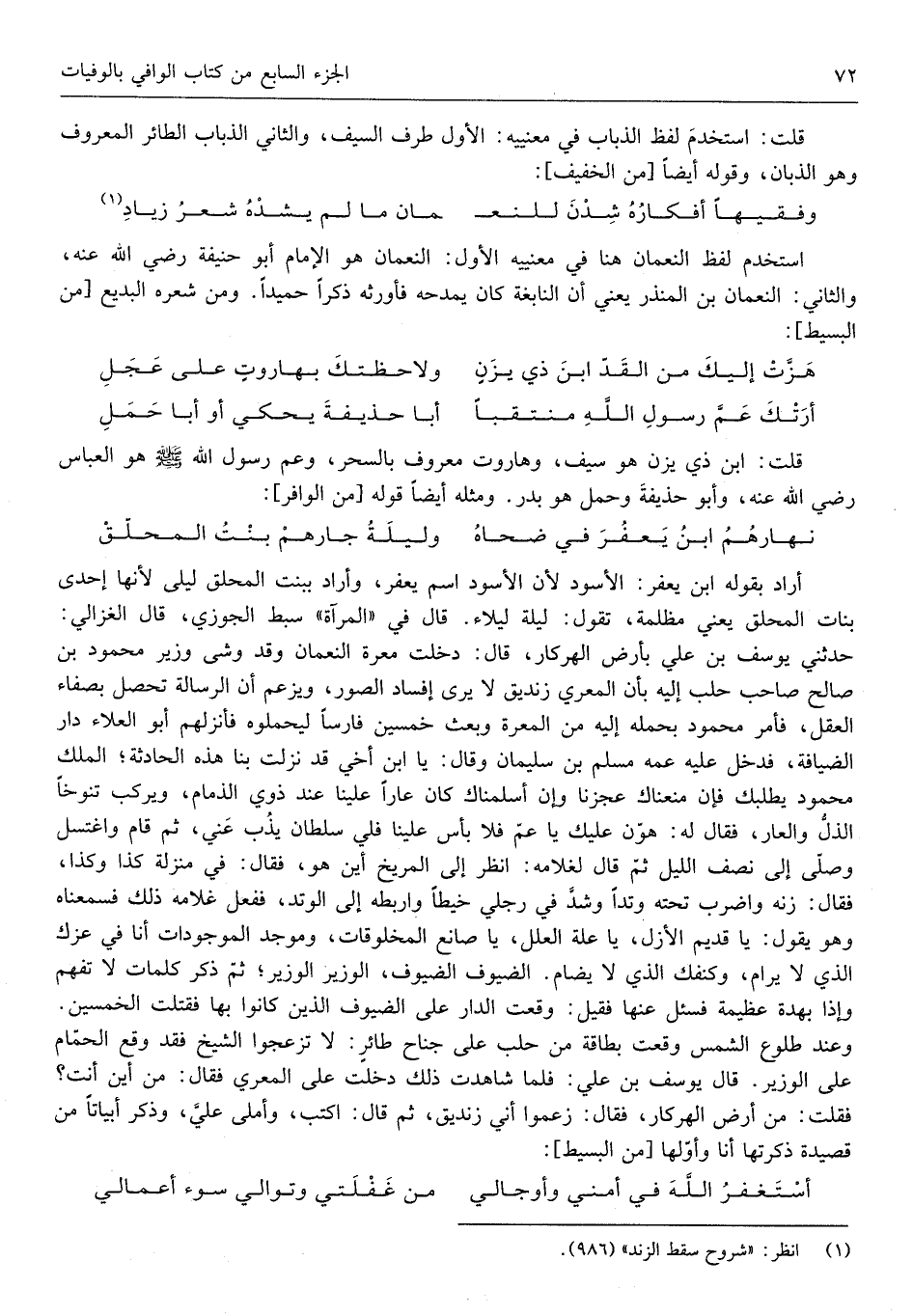 أَرَادَ بقوله ابْن يعفر الْأسود لِأَن الْأسود اسْم يعفر وَأَرَادَ ببنت المحلق ليلى لِأَنَّهَا إِحْدَى بَنَات المحلق يعين مظْلمَة تَقول لَيْلَة ليلاء قَالَ فِي الْمرْآة سبط الْجَوْزِيّ قَالَ الْغَزالِيّ حَدثنِي يُوسُف بن عَليّ بِأَرْض الهركار قَالَ دخلت معرة النُّعْمَان وَقد وشى وَزِير مَحْمُود بن صَالح صَاحب حلب إِلَيْهِ بِأَن المعري زنديق لَا يرى إِفْسَاد الصُّور وَيَزْعُم أَن الرسَالَة تحصل بصفاء الْعقل فَأمر مَحْمُود بِحمْلِهِ إِلَيْهِ من المعرة وَبعث خمسين فَارِسًا ليحملوه فأنزلهم أَبُو الْعَلَاء دَار الضِّيَافَة فَدخل عَلَيْهِ عَمه مُسلم بن سُلَيْمَان وَقَالَ يَا ابْن أخي قد نزلت بِنَا هَذِه الْحَادِثَة الْملك مَحْمُود يطلبك فَإِن منعناك عجزنا وَإِن أسلمناك كَانَ عاراً علينا عِنْد ذَوي الذمام ويركب تنوخاً الذل والعار فَقَالَ لَهُ هون عَلَيْك يَا عَم فَلَا بَأْس علينا فلي سُلْطَان يذب عني ثمَّ قَامَ واغتسل وَصلى إِلَى نصف اللَّيْل ثمَّ قَالَ لغلامه انْظُر إِلَى المريخ أَيْن هُوَ فَقَالَ فِي منزلَة كَذَا وَكَذَا فَقَالَ زنه وَاضْرِبْ تَحْتَهُ وتداً وَشد فِي رجْلي خيطاً واربطه إِلَى الوتد فَفعل غُلَامه ذَلِك فسمعناه يَقُول يَا قديم الْأَزَل يَا عِلّة الْعِلَل يَا صانع الْمَخْلُوقَات وموجد الموجدات أَنا فِي عزك الَّذِي لَا يرام وكنفك الَّذِي لَا يضام الضيوف الضيوف الْوَزير الْوَزير ثمَّ ذكر كَلِمَات لَا تفهم وَإِذا بهدة عَظِيمَة فَسئلَ عَنْهَا فَقيل وَقعت الدَّار على الضيوف الَّذين كَانُوا بهَا فقتلت)