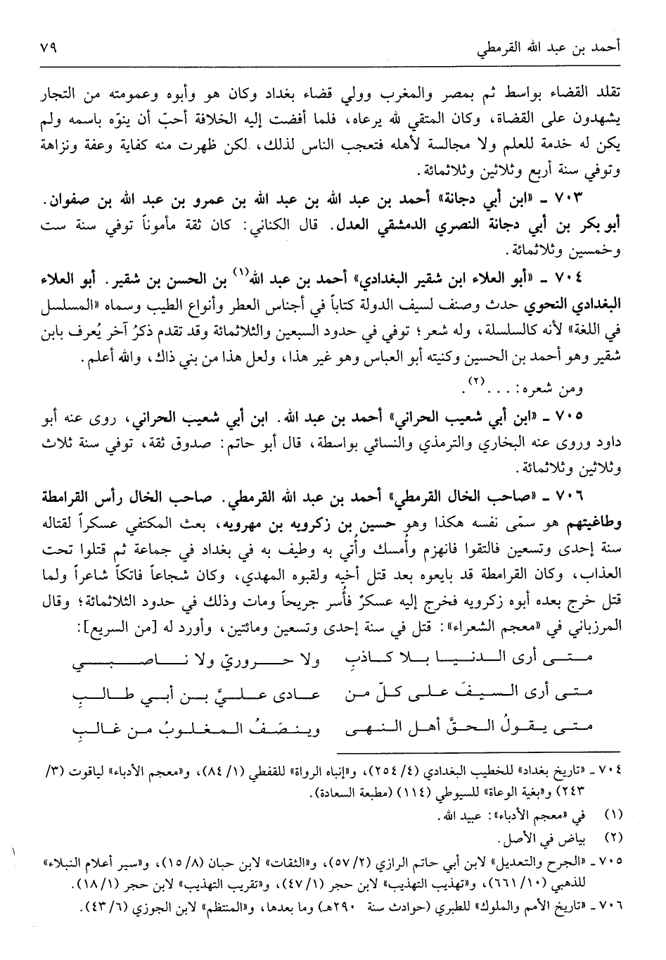 أَحْمد بن عبد الله القرمطي الْخَال رَأس القرامطة وطاغيتهم هُوَ سمى نَفسه هَكَذَا وَهُوَ حُسَيْن بن زكرويه بن مهرويه بعث المكتفي عسكراً لقتاله سنة إِحْدَى وَتِسْعين فَالْتَقوا فَانْهَزَمَ وَأمْسك وَأتي بِهِ وطيف بِهِ فِي بغداذ فِي جمَاعَة ثمَّ قتلوا تَحت الْعَذَاب وَكَانَ القرامطة قد بَايعُوهُ بعد قتل أَخِيه ولقبوه الْمهْدي وَكَانَ شجاعاً فاتكاً شَاعِرًا وَلما قتل خرج بعده أَبوهُ زكرويه فَخرج إِلَيْهِ عَسْكَر فَأسر جريحاً وَمَات وَذَلِكَ فِي حُدُود الثَّلَاث مائَة وَقَالَ المرزباني فِي مُعْجم الشُّعَرَاء قتل فِي سنة إِحْدَى وَتِسْعين وَمِائَتَيْنِ وَأورد لَهُ)