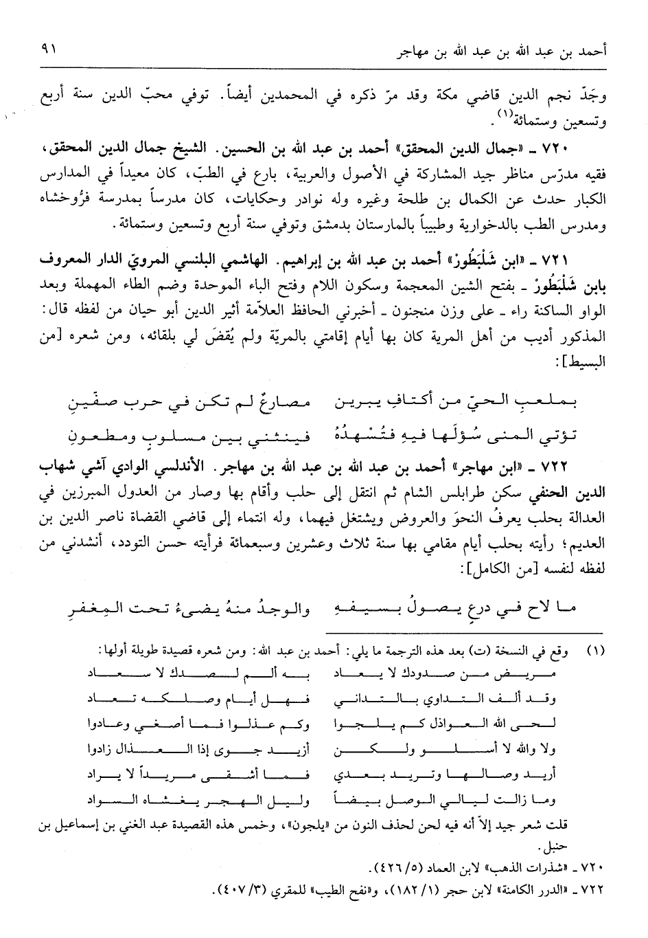 أَحْمد بن عبد الله بن عبد الله بن مهَاجر الأندلسي الْوَادي آشي شهَاب الدّين الْحَنَفِيّ سكن طرابلس الشَّام ثمَّ انْتقل إِلَى حلب وَأقَام بهَا وَصَارَ من الْعُدُول المبرزين فِي الْعَدَالَة بحلب يعرف النَّحْو وَالْعرُوض ويشتغل فيهمَا وَله انتماء إِلَى قَاضِي الْقُضَاة نَاصِر الدّين ابْن العديم رَأَيْته بحلب أَيَّام مقَامي بهَا سنة ثَلَاث وَعشْرين وَسبع مائَة فرأيته حسن التودد أَنْشدني من لَفظه لنَفسِهِ