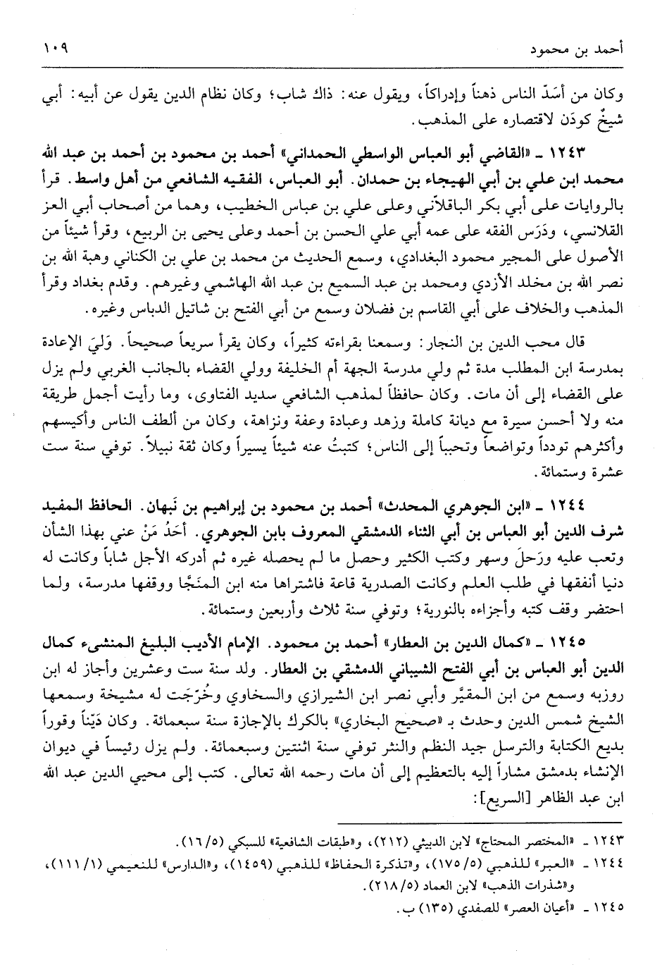 أَحْمد بن مَحْمُود بن أَحْمد بن عبد الله بن مُحَمَّد بن عَليّ ابْن أبي الهيجاء ابْن حمدَان أَبُو الْعَبَّاس الْفَقِيه الشَّافِعِي من أهل وَاسِط قَرَأَ بالروايات على أبي بكر الباقلاّني وعَلى عَليّ بن عَبَّاس الْخَطِيب هما من أَصْحَاب أبي الْعِزّ القلانسي ودرس الْفِقْه على عَمه أبي عَليّ الْحسن بن أَحْمد وعَلى يحيى بن الرّبيع وَقَرَأَ شَيْئا من أصُول على المجير مَحْمُود البغداذي وَسمع الحَدِيث من مُحَمَّد بن عَليّ ابْن الْكِنَانِي وَهبة الله بن نصر الله بن مخلد الْأَزْدِيّ وَمُحَمّد بن عبد السَّمِيع بن عبد الله الْهَاشِمِي وَغَيرهم وَقدم بغداذ وَقَرَأَ الْمَذْهَب وَالْخلاف على أبي الْقَاسِم ابْن فضلان وَسمع من أبي الْفَتْح ابْن شاتيل الدباس وَغَيره قَالَ محب الدّين ابْن النجار وَسَمعنَا بقرَاءَته كثيرا وَكَانَ يقْرَأ سَرِيعا صَحِيحا ولي الْإِعَادَة بمدرسة ابْن الْمطلب مُدَّة ثمَّ ولي مدرسة الْجِهَة أم الْخَلِيفَة وَولي الْقَضَاء بالجانب الغربي وَلم يزل على الْقَضَاء إِلَى أَن مَاتَ