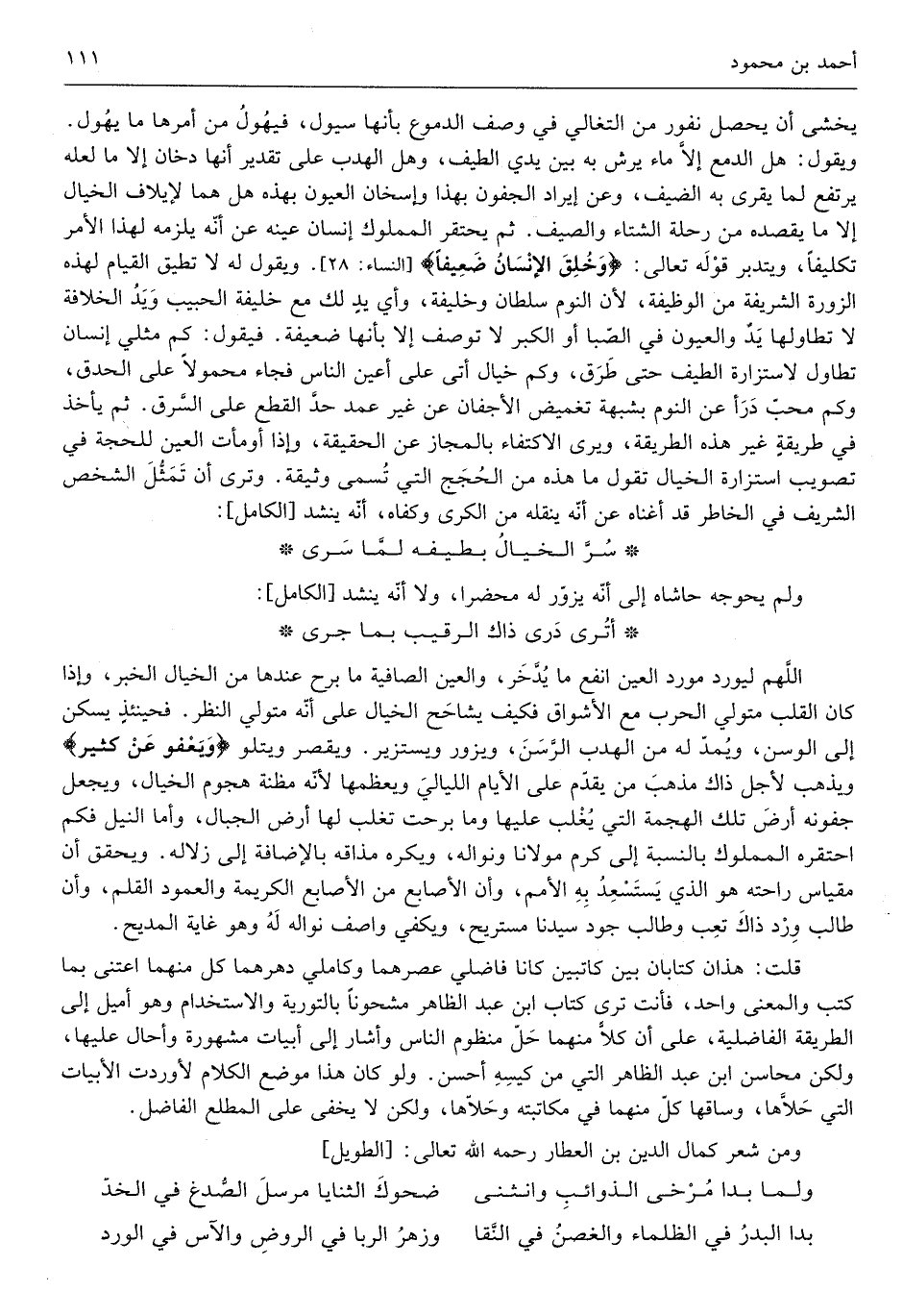يخْشَى أَن يحصل نفور من التغالي فِي وصف الدُّمُوع بِأَنَّهَا سيول فيهول من أمرهَا مَا يهول وَيَقُول هَل الدمع إِلَّا مَاء يرش بِهِ بَين يَدي الطيف وَهل الهدب على تَقْدِير أَنَّهَا دُخان إِلَّا مَا لَعَلَّه يرْتَفع لما يقرى بِهِ الضَّيْف وَعَن إِيرَاد الجفون بِهَذَا وإسخان الْعُيُون بِهَذِهِ هَل هما لِإِيلَافِ الخيال إِلَّا مَا يَقْصِدهُ من رحْلَة الشتَاء والصيف ثمَّ يحتقر الْمَمْلُوك إِنْسَان عينه عَن أنّه يلْزمه لهَذَا الْأَمر تكليفاً ويتدبر قَوْله تَعَالَى وخُلِقَ الإنسانُ ضَعِيفا وَيَقُول لَهُ لَا تطِيق الْقيام لهَذِهِ الزورة الشَّرِيفَة من الْوَظِيفَة لِأَن النّوم سُلْطَان وَأي يَد لَك مَعَ خَليفَة الحبيب خَليفَة الحبيب وَيَد الْخلَافَة لَا تطاولها يَد والعيون فِي الصِّبَا أَو الْكبر لَا تُوصَف إِلَّا بِأَنَّهَا ضَعِيفَة فَيَقُول كم مثلي إِنْسَان تطاول لاستزارة الطيف حَتَّى طرق وَكم خيال أَتَى على أعين النَّاس فجَاء مَحْمُولا على الحدق وَكم محبّ دَرأ عَن النّوم بِشُبْهَة تغميض الأجفان عَن غير عمد حدَّ الْقطع على السرق ثمَّ يَأْخُذ فِي طريقةٍ غير هَذِه الطَّرِيقَة وَيرى الِاكْتِفَاء بالمجاز عَن الْحَقِيقَة وَإِذا أَوْمَأت الْعين للحجة فِي تصويب استزارة الخيال تَقول مَا هَذِه من الْحجَج الَّتِي تسمى وَثِيقَة وَترى أنّ تمثل الشَّخْص لشريف فِي الخاطر قد أغناه عَن أنّه يَنْقُلهُ من الْكرَى وَكَفاهُ أنّه ينشد سرّ الخيال بطيفه لّما سرى وَلم يحوجه حاشاه إِلَى أنّه يزوّر لَهُ محضرا وَلَا أنّه ينشد أَتَرَى درى ذَاك الرَّقِيب بِمَا جرى)