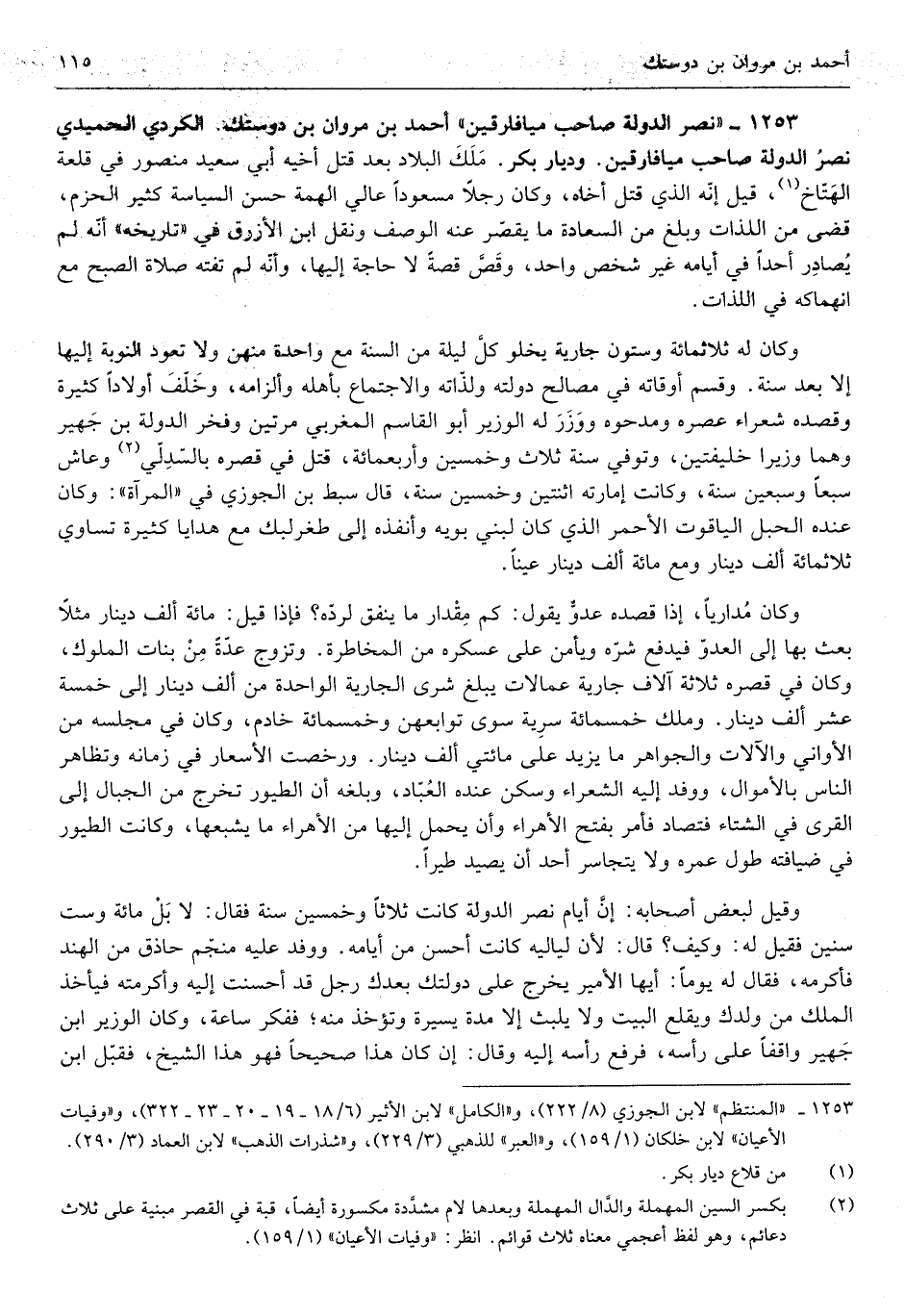 أَحْمد بن مَرْوَان بن دوستك الْكرْدِي الْحميدِي نصر الدولة صَاحب ميافارقين ودياربكر ملك الْبِلَاد بعد قتل أَخِيه أبي سعيد مَنْصُور فِي قلعة الهتّاخ قيل إنّه الَّذِي قتل أَخَاهُ وَكَانَ رجلا مسعوداً عالي الهمة حسن السياسة كثير الحزم قضى من اللَّذَّات وَبلغ من السَّعَادَة مَا يقصّر عَنهُ الْوَصْف وَنقل ابْن الْأَزْرَق فِي تَارِيخه أنّه لم يصادر أحدا فِي أَيَّامه غير شخص وَاحِد وقصّ قصَّة لَا حَاجَة إِلَيْهَا وَأَنه لم تفته صَلَاة الصُّبْح مَعَ انهماكه فِي اللَّذَّات وَكَانَ لَهُ ثَلَاثمِائَة وَسِتُّونَ جَارِيَة يَخْلُو كل لَيْلَة من السّنة مَعَ وَاحِدَة مِنْهُنَّ وَلَا تعود النّوبَة إِلَيْهَا إِلَّا بعد سنة وَقسم أوقاته فِي مصَالح دولته ولذاته والاجتماع بأَهْله وألزمه وَخلف أَوْلَادًا كَثِيرَة وقصده شعراء عصره ومدحوه ووزر لَهُ الْوَزير أَبُو الْقَاسِم المغربي مرَّتَيْنِ وفخر الدولة ابْن جهير وهما وزيرا خليفتين وَتُوفِّي سنة ثَلَاث وَخمسين وَأَرْبَعمِائَة قتل فِي قصره بالسدلي وعاش سبعا وَسبعين سنة وَكَانَت إمارته اثْنَتَيْنِ وَخمسين سنة قَالَ سبط ابْن الْجَوْزِيّ فِي الْمرْآة وَكَانَ عِنْده الْحَبل الْيَاقُوت الْأَحْمَر الَّذِي كَانَ لبني بويه وأنفذه إِلَى طغرلبك مَعَ هَدَايَا كَثِيرَة تَسَاوِي ثَلَاثمِائَة ألف دِينَار وَمَعَ مائَة ألف دِينَار عينا وَكَانَ مدارياً إِذا قَصده عَدو يَقُول كم مِقْدَار مَا ينْفق لرده فَإِذا قيل مائَة ألف دِينَار مثلا بعث بهَا إِلَى الْعَدو فَيدْفَع شَره ويأمن على عسكره من المخاطرة وَتزَوج عدَّة من بَنَات الْمُلُوك وَكَانَ فِي قصره ثَلَاثَة آلَاف جَارِيَة عمالات يبلغ شرى الْجَارِيَة الْوَاحِدَة من ألف دِينَار إِلَى خَمْسَة عشر ألف دِينَار وَملك خَمْسمِائَة سَرِيَّة سوى توابعهن وَخَمْسمِائة خَادِم وَكَانَ فِي مَجْلِسه من الْأَوَانِي والآلات والجواهر مَا يزِيد على مِائَتي ألف دِينَار ورخصت الأسعار فِي زَمَانه وتظاهر النَّاس بالأموال ووفد إِلَيْهِ الشُّعَرَاء وَسكن عِنْده الْعباد وبلغه أَن الطُّيُور تخرج من الْجبَال إِلَى الْقرى فِي الشتَاء فتصاد فَأمر بِفَتْح الأهراء وَأَن يحمل إِلَيْهَا من الأهراء مَا يشبعها وَكَانَت الطُّيُور فِي ضيافته طول عمره وَلَا يتجاسر أحد أَن يصيد طيراً وَقيل لبَعض أَصْحَابه إِن أَيَّام نصر الدولة كَانَت ثَلَاثًا وَخمسين سنة فَقَالَ لَا بل مائَة وست سِنِين فَقيل لَهُ وَكَيف قَالَ لِأَن لياليه كَانَت أحسن من أَيَّامه