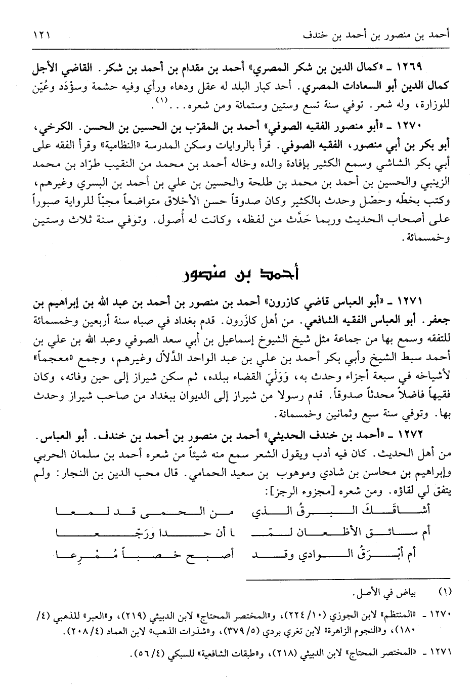 أَحْمد بن مَنْصُور بن أَحْمد بن عبد الله بن إِبْرَاهِيم بن جَعْفَر أَبُو الْعَبَّاس الْفَقِيه الشَّافِعِي من أهل كازرون قدم بغداذ فِي صباه سنة أَرْبَعِينَ وَخَمْسمِائة للتفقه وَسمع بهَا من جمَاعَة مثل شيخ الشُّيُوخ إِسْمَاعِيل ابْن أبي سعد الصُّوفِي وَعبد الله بن عَليّ بن أَحْمد سبط الشَّيْخ وَأبي بكر أَحْمد بن عَليّ بن عبد الْوَاحِد الدَّلال وَغَيرهم وَجمع معجماً لأشياخه فِي سَبْعَة أَجزَاء وَحدث بِهِ وَولي الْقَضَاء بِبَلَدِهِ ثمَّ سكن شيراز إِلَى حِين وَفَاته وَكَانَ فَقِيها فَاضلا مُحدثا صَدُوقًا قدم رَسُولا من شيراز إِلَى الدِّيوَان ببغداذ من صَاحب شيراز وَحدث بهَا وَتُوفِّي سنة سبع وَثَمَانِينَ وَخَمْسمِائة)