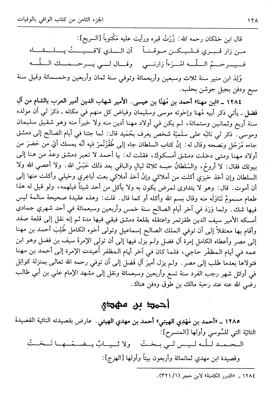 أَحْمد بن مهنا بن عِيسَى الْأَمِير شهَاب الدّين أَمِير الْعَرَب بِالشَّام من آل فضل يَأْتِي ذكر أَبِيه مهنا وإخواته مُوسَى وَسليمَان وفياض كل مِنْهُم فِي مَكَانَهُ ذكر لي أَن مولده سنة أَربع وَثَمَانِينَ وسِتمِائَة لم يكن فِي أَوْلَاد مهنا أدين مِنْهُ وَلَا خيرا مِنْهُ وَهُوَ شَقِيق سُلَيْمَان ومُوسَى ذكر لي نَائِبه على سلميّة شخص يعرف بحميد قَالَ لّما جِئْنَا فِي أَيَّام الصَّالح إِلَى دمشق جَاءَهُ مرحلّ ونصحه وَقَالَ لَهُ إنّ كتاب السُّلْطَان جَاءَ إِلَى طقزتمر فِيهِ أنّه يمسك أيّ من حضر من أولد مهنا وَمَتى دخلت دمشق أمسكوك فَقلت لَهُ يَا أَحْمد لَا تعبر دمشق وعد من هُنَا إِلَى بيوتك فَقَالَ لَا أروح والسلّطان حَبسه ثَلَاثَة ليالٍ وَالْبَاقِي بعد ذَلِك حبس الله وَلَا أعصي الله وَلَا السُّلْطَان وَإِن أَخذ خبزي أكلت من أملاكي وَإِن أَخذ أملاكي بِعْت أباعري وخيلي وأكلت مِنْهَا)