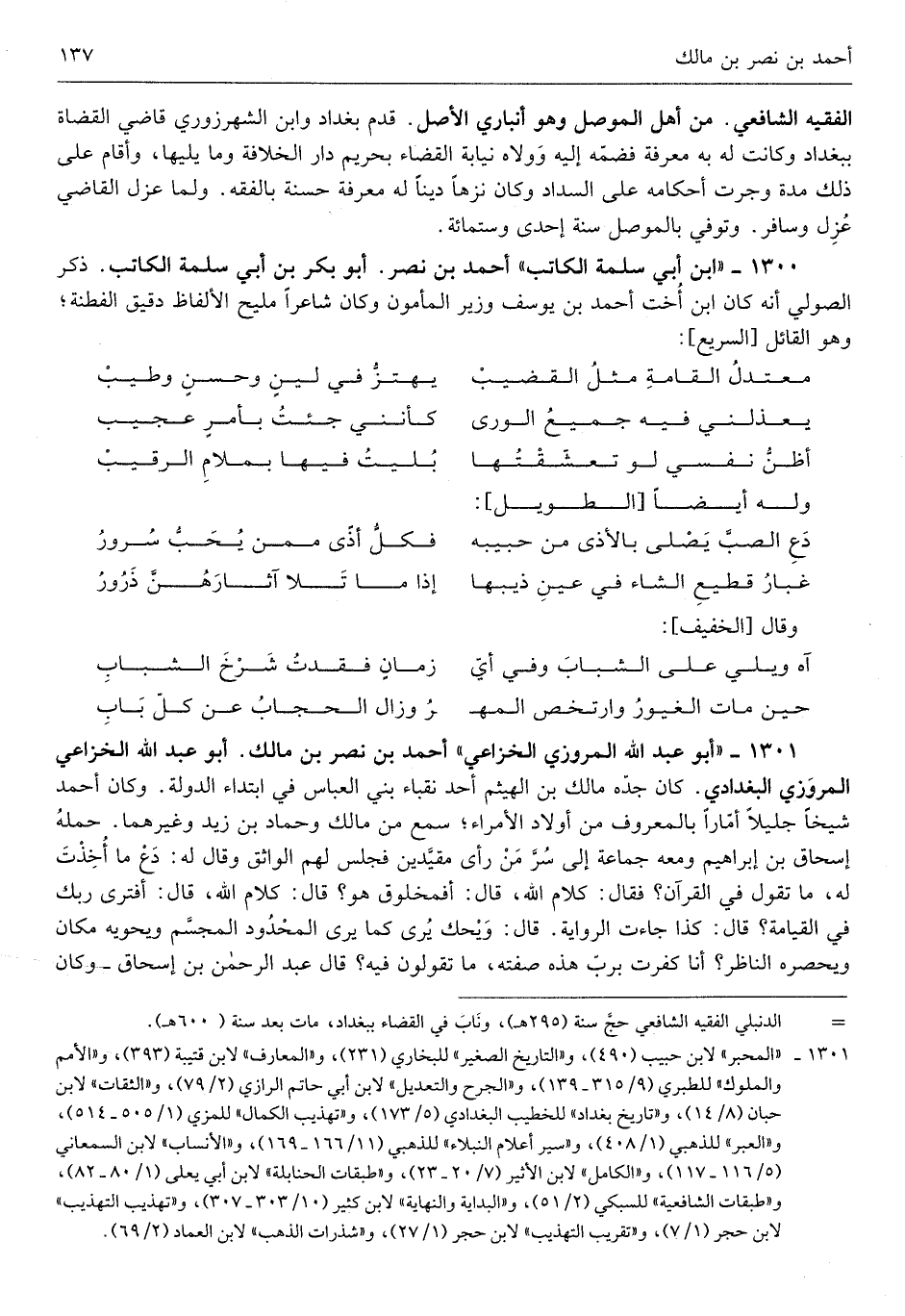 أَحْمد بن نصر بن مَالك أَبُو عبد الله الْخُزَاعِيّ الْمروزِي البغداذي كَانَ جدّه مَالك بن الْهَيْثَم أحد نقباء بني الْعَبَّاس فِي ابْتِدَاء الدولة وَكَانَ أَحْمد شَيخا جَلِيلًا أمّاراً بِالْمَعْرُوفِ من أَوْلَاد الْأُمَرَاء سمع من مَالك وَحَمَّاد بن زيد وَغَيرهمَا