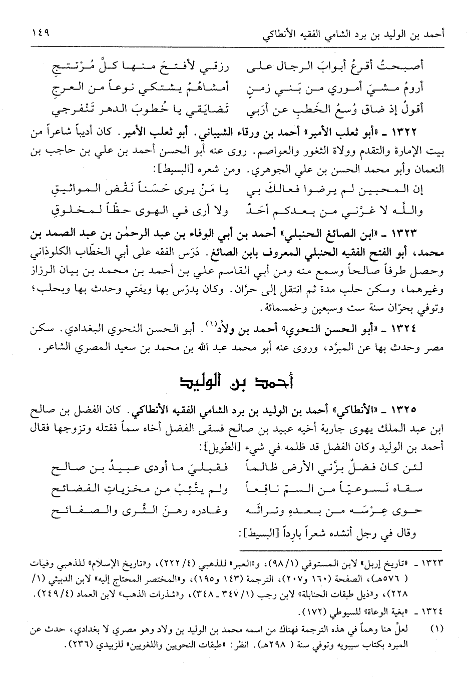 أَحْمد بن الْوَلِيد بن برد الشَّامي الْفَقِيه الْأَنْطَاكِي كَانَ الْفضل بن صَالح ابْن عبد الْملك يهوى جَارِيَة أَخِيه عبيد بن صَالح فسقى الْفضل أَخَاهُ سما فَقتله وَتَزَوجهَا فَقَالَ أَحْمد بن الْوَلِيد وَكَانَ الْفضل قد ظلمه فِي شَيْء