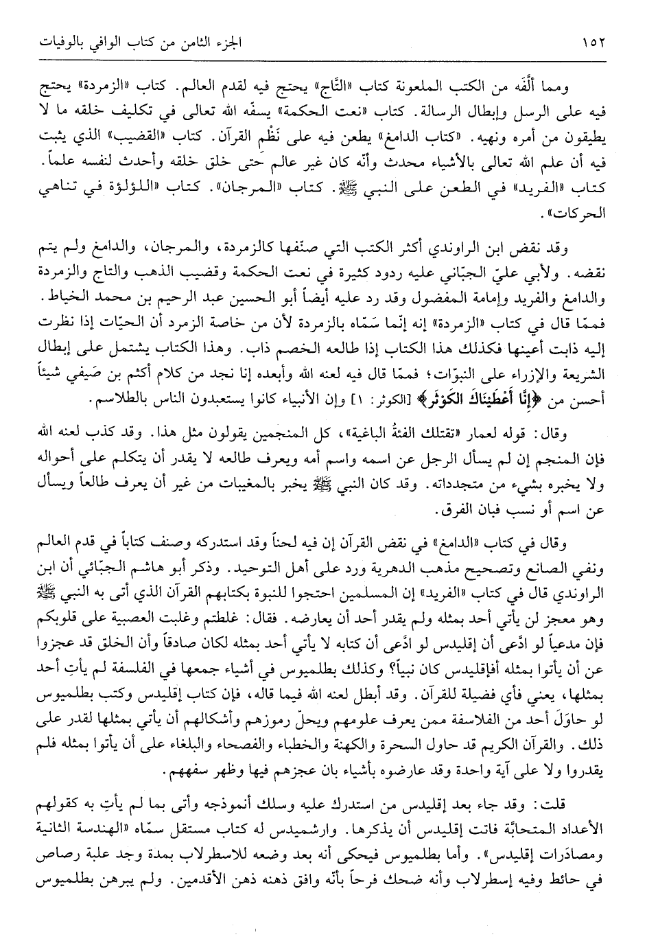 بطلميوس فِي أَشْيَاء جمعهَا فِي الفلسفة لم يَأْتِ أحد بِمِثْلِهَا يَعْنِي فَأَي فَضِيلَة لِلْقُرْآنِ وَقد أبطل لَعنه الله فِيمَا قَالَه فَإِن كتاب إقليدس وَكتب بطلميوس لَو حاول أحد من الفلاسفة مِمَّن يعرف علومهم ويحلّ رموزهم وأشكالهم أَن يَأْتِي بِمِثْلِهَا لقدر على ذَلِك وَالْقُرْآن االكريم قد حاول السَّحَرَة والكهنة والخطباء والفصحاء والبلغاء على أَن يَأْتُوا بِمثلِهِ فَلم يقدروا وَلَا على آيَة وَاحِدَة وَقد عارضوه بأَشْيَاء بَان عجزهم فِيهَا وَظهر سفههم قلت وَقد جَاءَ بعد إقليدس من استدرك عَلَيْهِ وسلك أنموذجه وأتى بِمَا لم يأتِ بِهِ كَقَوْلِهِم الْأَعْدَاد المتحابّة فَاتَت إقليدس أَن يذكرهَا وارشميدس لَهُ كتاب مُسْتَقل سمّاه الهندسة الثَّانِيَة ومصادرات إقليدس وَأما بطلميوس فيحكى أَنه بعد وَضعه للاسطرلاب بِمدَّة وجد علبة رصاص فِي حَائِط وَفِيه إسطرلاب وَأَنه ضحك فَرحا بِأَنَّهُ ذهنه ذهن الأقدمين وَلم يبرهن بطلميوس