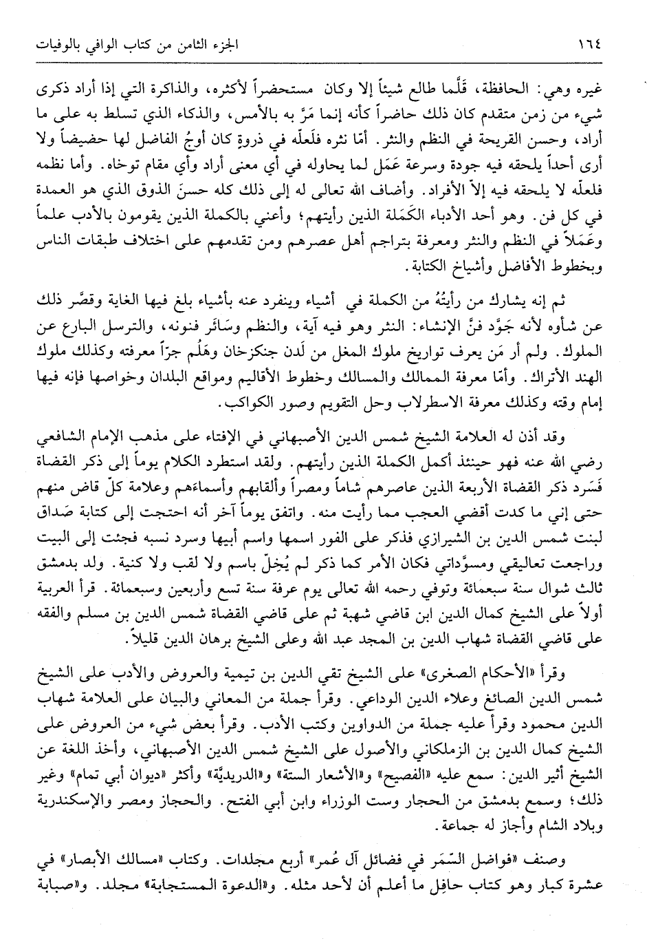 وأضاف الله تَعَالَى لَهُ إِلَى ذَلِك كُله حسن الذَّوْق الَّذِي هُوَ الْعُمْدَة فِي كل فن وَهُوَ أحد الأدباء الكملة الَّذين رَأَيْتهمْ وأعني بالكملة الَّذين رَأَيْتهمْ وأعني بالكملة الَّذين يقومُونَ بالأدب علما وَعَملا فِي النّظم والنثر وَمَعْرِفَة بتراجم أهل عصرهم وَمن تقدمهم على اخْتِلَاف طَبَقَات لناس وبخطوط الأفاضل وأشياخ الْكِتَابَة ثمَّ إِنَّه يُشَارك من رَأَيْته من الكملة فِي أَشْيَاء وينفرد عَنهُ بأَشْيَاء بلغ فِيهَا الْغَايَة وقصَّر ذَلِك عَن شأوه لِأَنَّهُ جوَّد فنَّ الْإِنْشَاء النثر وَهُوَ فِيهِ آيَة وَالنّظم وساير فنونه والترسل البارع عَن الْمُلُوك وَلم أر من يعرف تواريخ مُلُوك الْمغل من لدن جنكزخان وهلم وجرّاً مَعْرفَته وَكَذَلِكَ مُلُوك الْهِنْد الأتراك وأمّا معرفَة الممالك والمسالك وخطوط الأقاليم ومواقع الْبلدَانِ وخواصها فَإِنَّهُ فِيهَا إِمَام وقته وَكَذَلِكَ معرفَة الاسطرلاب وَحل التَّقْوِيم وصور الْكَوَاكِب وَقد أذن لَهُ العالمة الشَّيْخ شمس الدّين الْأَصْبَهَانِيّ فِي الْإِفْتَاء على مَذْهَب الإِمَام الشَّافِعِي رَضِي الله عَنهُ فَهُوَ حِينَئِذٍ أكمل الَّذين رَأَيْتهمْ وَلَقَد استطرد الْكَلَام يَوْمًا إِلَى ذكر الْقُضَاة فسرد الْقُضَاة الْأَرْبَعَة الَّذين عاصرهم شاماً ومصراً وألقابهم وأسماءهم وعلامة كلِّ قَاض مِنْهُم حَتَّى إِنِّي مَا كدت أَقْْضِي الْعجب مِمَّا رَأَيْت مِنْهُ وَاتفقَ يَوْمًا آخر أَنه احتجت إِلَى كِتَابَة صدَاق لبِنْت شمس الدّين ابْن الشِّيرَازِيّ فَذكر على الْفَوْر اسْمهَا وَاسم أَبِيهَا وسرد نسبه فَجئْت إِلَى الْبَيْت وراجعت تعاليقي ومسوَّداتي فَكَانَ الْأَمر كَمَا ذكر لم يخلّ باسم وَلَا لقب وَلَا كنية ولد بِدِمَشْق ثَالِث شَوَّال سنة سَبْعمِائة وَتُوفِّي رَحمَه الله تَعَالَى يَوْم عَرَفَة سنة تسع وَأَرْبَعين وَسَبْعمائة قَرَأَ الْعَرَبيَّة أَولا على الشَّيْخ كَمَال الدّين ابْن قَاضِي شُهْبَة ثمَّ قَاضِي الْقُضَاة شمس الدّين ابْن مُسلم وَالْفِقْه على قَاضِي الْقُضَاة شهَاب الدّين ابْن الْمجد عبد الله وعَلى الشَّيْخ برهَان الدّين قَلِيلا وَقَرَأَ الْأَحْكَام الصُّغْرَى على الشَّيْخ تَقِيّ الدّين ابْن تَيْمِية وَالْعرُوض وَالْأَدب على الشَّيْخ شمس الدّين الصايغ وعلاء الدّين الوداعي وَقَرَأَ جملَة من الْمعَانِي وَالْبَيَان)