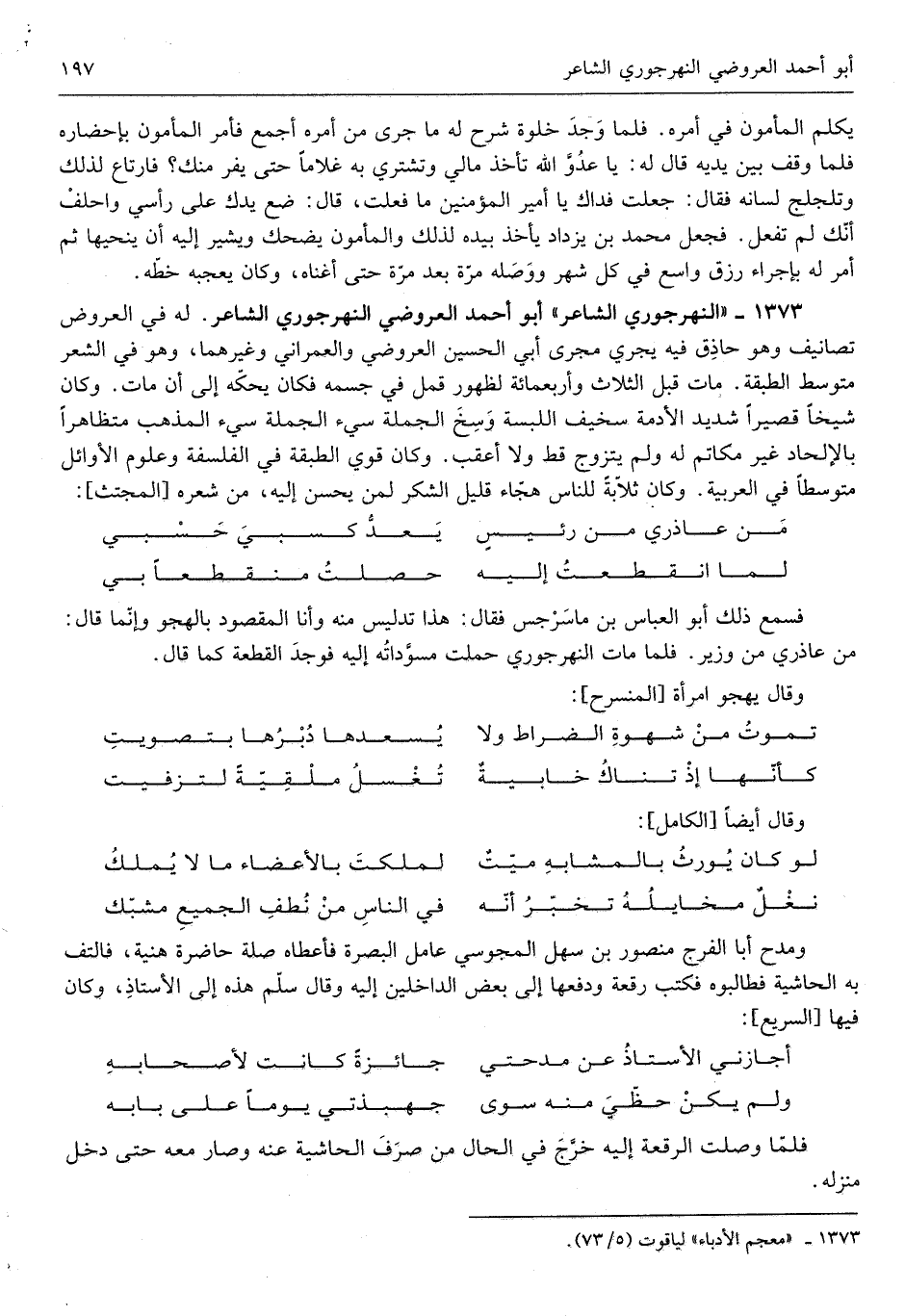 أَبُو أَحْمد الْعَرُوضِي النهروجوري الشَّاعِر لَهُ فِي الْعرض تصانيف وَهُوَ حاذق فِيهِ يجْرِي مجْرى أبي الْحُسَيْن الْعَرُوضِي والعمراني وَغَيرهمَا وَهُوَ فِي الشّعْر متوسط الطَّبَقَة مَاتَ قبل الثَّلَاث وَأَرْبَعمِائَة لظُهُور قمل فِي جِسْمه فَكَانَ يحكّه إِلَى أَن مَاتَ وَكَانَ شَيخا قَصِيرا شَدِيد الأدمة سخيف اللبسة وسخ الْجُمْلَة سيءّ الْجُمْلَة سيءّ الْمَذْهَب متظاهراً بالإلحاد غير مكاتم لَهُ وَلم يتَزَوَّج قطّ وَلَا أعقب وَكَانَ قوي الطَّبَقَة فِي الفلسفة وعلوم الْأَوَائِل متوسطاً فِي الْعَرَبيَّة