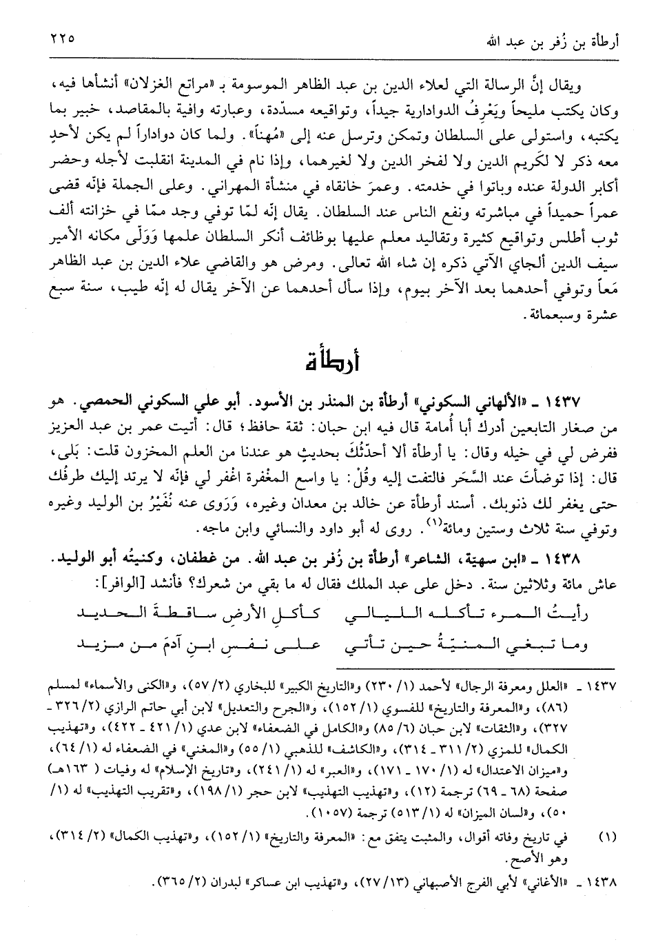 أَرْطَأَة بن الْمُنْذر بن الْأسود أَبُو عَليّ السكونِي الْحِمصِي هُوَ من صغَار التَّابِعين أدْرك أَبَا أُمَامَة قَالَ فِيهِ ابْن حبَان ثِقَة حَافظ قَالَ أتيت عمر بن عبد الْعَزِيز فَفرض لي فِي خيله وَقَالَ يَا أَرْطَأَة أَلا أحدّثك بحديثٍ هُوَ عندنَا من الْعلم المخزون قلت بلَى قَالَ إِذا تَوَضَّأت عِنْد السّحر فَالْتَفت إِلَيْهِ وَقل يَا وَاسع الْمَغْفِرَة اغْفِر لي فإنّه لَا يرتدّ إِلَيْك طرفك حَتَّى يغْفر لَك ذنوبك أسْند أَرْطَأَة عَن خَالِد بن معدان وَغَيره وروى عَنهُ نفير بن الْوَلِيد وَغَيره وَتُوفِّي سنة ثَلَاث وَسِتِّينَ وَمِائَة روى لَهُ أَبُو دَاوُد وَالنَّسَائِيّ وَابْن ماجة