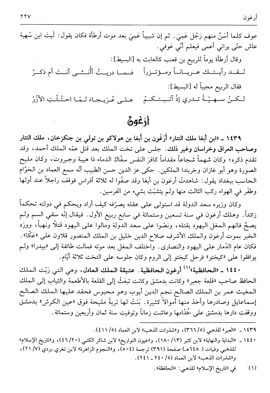 أرغون بن أبغا بن هولاكو بن تولي بن جنكزخان ملك التتار وَصَاحب الْعرَاق وخراسان وَغير ذَلِك جلس على تخت الْملك بعد قتل عمّه الْملك أَحْمد وَقد تقدم ذكره وَكَانَ شهماً شجاعاً مقداماً كَافِر النَّفس سفّاك الدِّمَاء ذَا هَيْبَة وجبروت وَكَانَ مليح الصُّورَة وَهُوَ أَبُو غازان وخربندا الْملكَيْنِ حكى عز الدّين حسن الطَّبِيب أَنه سمع الْعِمَاد بن الخوام الحاسب ببغداذ يَقُول شاهدت أرغون بن أبغا وَقد صفّوا لَهُ ثَلَاثَة أَفْرَاس فَوقف رَاجِلا عِنْد أَولهَا وطفر فِي الْهَوَاء ركب الثَّالِث مِنْهَا وَلم يتشبّث بِشَيْء من الفرسين وَكَانَ وزيره سعد الدولة قد استولى على عقله يصرّفه كَيفَ أَرَادَ وَيحكم فِي دولته تحكماً زَائِدا وَهلك أرغون فِي سنة تسعين وسِتمِائَة فِي سَابِع ربيع الأول فَيُقَال إِنَّه سقِِي السم وَلم يصحّ فاتهم الْمغل الْيَهُود بقتْله ونصّوا على سعد الدولة ومالوا على الْيَهُود قتلا ونهباً وَورد الْخَبَر بِمَوْت أرغون وَالْملك الْأَشْرَف صَلَاح الدّين خَلِيل ابْن الْملك الْمَنْصُور قلاوون على عكّا فَكَانَ عَام الدّمار على الْيَهُود وَالنَّصَارَى وَاخْتلف الْمغل بعد مَوته فمالت طَائِفَة إِلَى بيدرا وَلم يوافقوا على كيختو فَرَحل كيختو إِلَى الرّوم وَكَانَ جُلُوسه على التخت ثَلَاثَة أَيَّام