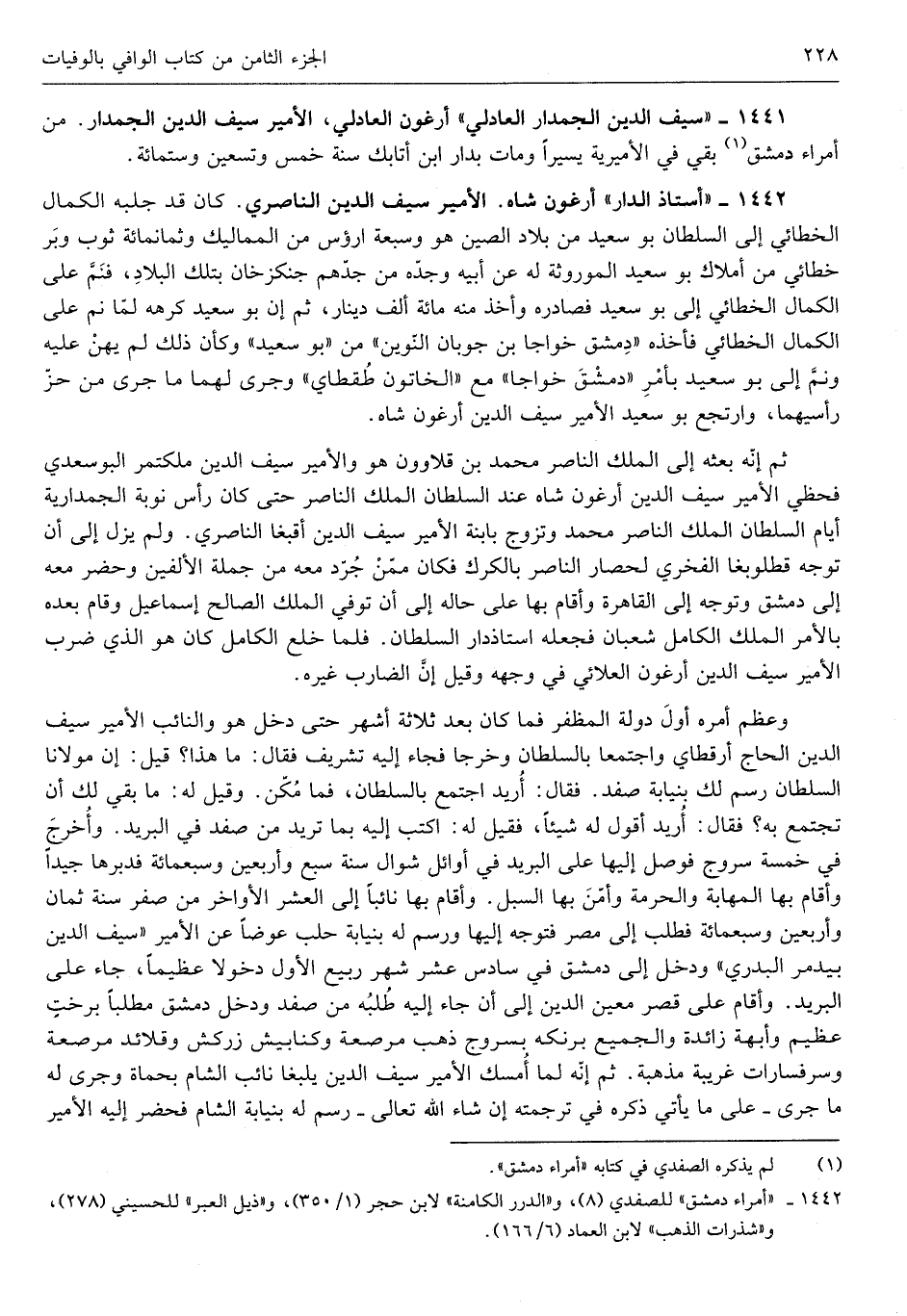 ثمَّ إِنَّه بَعثه إِلَى الْملك النَّاصِر مُحَمَّد بن قلاوون هُوَ والأمير سيف الدّين ملكتمر البوسعيدي فحظي الْأَمِير سيف الدّين أرغون شاه عِنْد السُّلْطَان الْملك النَّاصِر مُحَمَّد وَتزَوج بابنة الْأَمِير سيف الدّين أقبغا الناصري وَلم يزل إِلَى أَن توجه قطلوبغا لفخري لحصار النَّاصِر بالكرك فَكَانَ ممّن جرّد مَعَه من جملَة الْأَلفَيْنِ وَحضر مَعَه إِلَى دمشق وَتوجه إِلَى الْقَاهِرَة وَأقَام بهَا على حَاله إِلَى أَن توفّي الْملك الصَّالح إِسْمَاعِيل وَقَامَ بعده بِالْأَمر الْملك الْكَامِل شعْبَان فَجعله استاذ دَار السُّلْطَان فَلَمَّا خلع الْكَامِل كَانَ هُوَ الَّذِي ضرب الْأَمِير سيف الدّين أرغون العلائي فِي وَجهه وَقيل إنَّ الضَّارِب غَيره وَعظم أمره أول دولة المظفر فَمَا كَانَ بعد ثَلَاثَة أشهر حَتَّى دخل هُوَ والنائب الْأَمِير سيف الدّين الْحَاج أرقطاي واجتمعا بالسلطان وخرجا فجَاء إِلَيْهِ تشريف فَقَالَ مَا هَذَا قيل إِن مَوْلَانَا السُّلْطَان رسم لَك بنيابة صفد فَقَالَ أُرِيد اجْتمع بالسلطان فَمَا مكّن وَقيل لَهُ مَا بَقِي لَك أَن تَجْتَمِع بِهِ فَقَالَ أُرِيد أَن أَقُول لَهُ شَيْئا فَقيل لَهُ اكْتُبْ إِلَيْهِ بِمَا تُرِيدُ من صفد فِي الْبَرِيد وَأخرج فِي خَمْسَة سروج فوصل إِلَيْهَا على الْبَرِيد فِي أَوَائِل شَوَّال سنة سبع وَأَرْبَعين وَسَبْعمائة فدبرها جيدا وَأقَام بهَا المهابة وَالْحُرْمَة وأمّن بهَا السبل وَأقَام بهَا نَائِبا إِلَى الْعشْر الْأَوَاخِر من صفر سنة ثَمَان وَأَرْبَعين وَسَبْعمائة فَطلب إِلَى مصر فَتوجه إِلَيْهَا ورسم لَهُ بنيابة حلب عوضا عَن الْأَمِير سيف الدّين بيدمر البدري وَدخل إِلَى دمشق فِي سادس عشر شهر ربيع الأول دُخُولا عَظِيما جَاءَ على الْبَرِيد وَأقَام على قصر معِين الدّين إِلَى أَن جَاءَ إِلَيْهِ طلبه من صفد وَدخل دمشق مطلباً برختٍ عَظِيم وأبهة زَائِدَة والجميع برنكه بسروج ذهب مرصعة وكنابيش زركش وقلائد مرصعة وسرفسارات غربية مذهبَة ثمَّ إِنَّه لما أمسك الْأَمِير سيف الدّين يلبغا نَائِب الشَّام بحماة وَجرى لَهُ مَا جرى على مَا يَأْتِي ذكره فِي تَرْجَمته إِن شَاءَ الله تَعَالَى رسم لَهُ بنيابة الشَّام فَحَضَرَ إِلَيْهِ الْأَمِير