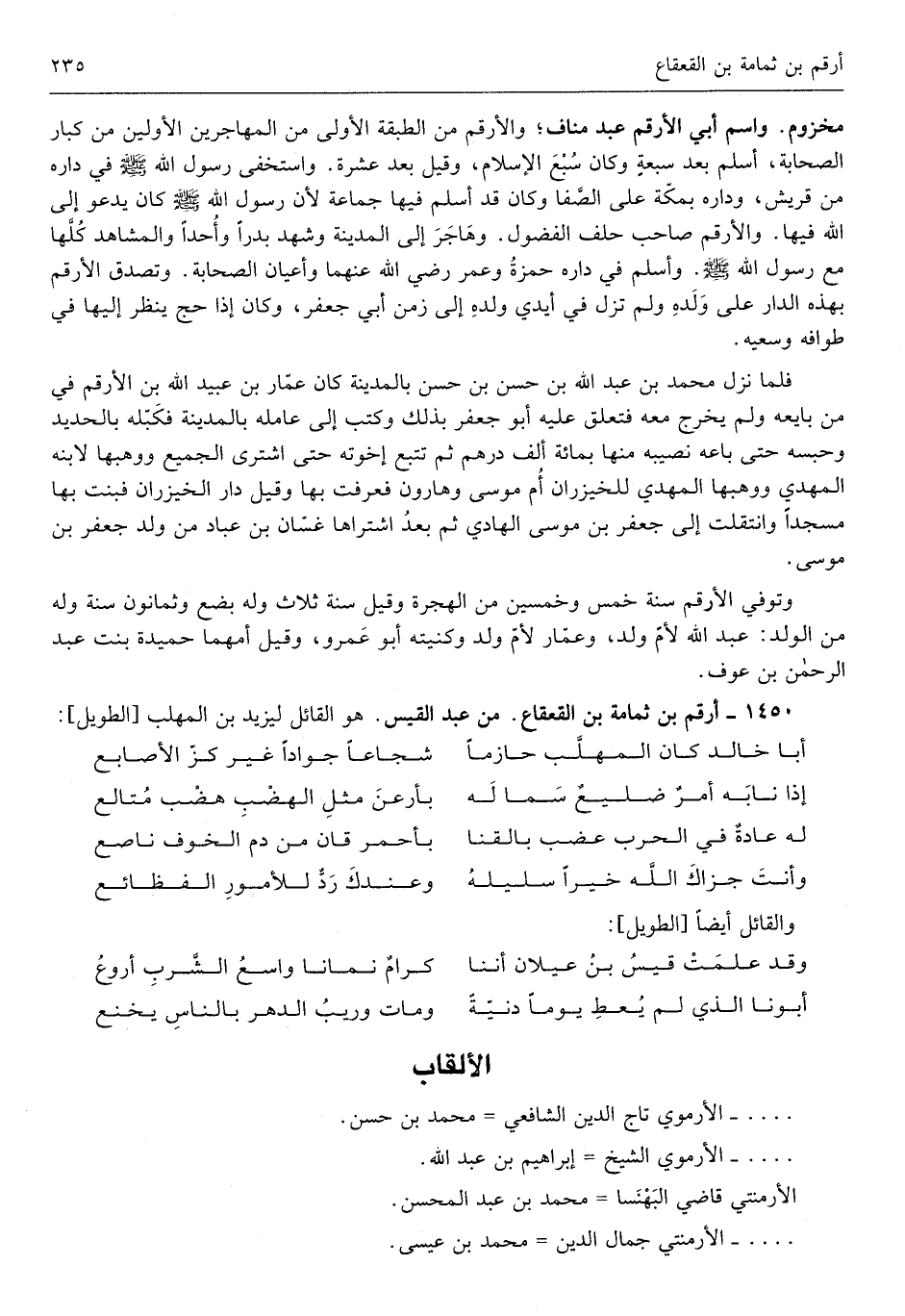 واستخفى رَسُول الله صلى الله عَلَيْهِ وَسلم فِي دَاره من قُرَيْش وداره بمكّة على الصّفا وَكَانَ قد أسلم فِيهَا جمَاعَة لأنّ رَسُول الله صلى الله عَلَيْهِ وَسلم كَانَ يَدْعُو إِلَى الله فِيهَا والأرقم صَاحب حلف الفضول وَهَاجَر إِلَى الْمَدِينَة وَشهد بَدْرًا وأحداً والمشاهد كلهَا مَعَ رَسُول الله صلى الله عَلَيْهِ وَسلم وَأسلم فِي دَاره حَمْزَة وَعمر رَضِي الله عَنْهُمَا وأعيان الصَّحَابَة وَتصدق الأرقم بِهَذِهِ الدَّار على وَلَده وَلم تزل فِي أَيدي وَلَده إِلَى زمن أبي جَعْفَر وَكَانَ إِذا حج ينظر إِلَيْهَا فِي طَوَافه وسعيه فَلَمَّا نزل مُحَمَّد بن عبد الله بن حسن بن حسن بِالْمَدِينَةِ كَانَ عمّار بن عبيد الله بن الأرقم فِي من بَايعه فكبّله بالحديد وحبسه حَتَّى بَاعه نصِيبه مِنْهَا بِمِائَة ألف دِرْهَم ثمَّ تتبع إخْوَته حَتَّى اشْترى الْجَمِيع ووهبها لِابْنِهِ الْمهْدي ووهبها الْمهْدي للخيزران أم مُوسَى وَهَارُون فَعرفت بهَا وَقيل دَار الخيزران فبنت بهَا مَسْجِدا وانتقلت إِلَى جَعْفَر بن مُوسَى الْهَادِي ثمَّ اشْتَرَاهَا غسّان بن عباد من ولد جَعْفَر بن مُوسَى وَتُوفِّي الأرقم سنة خمس وَخمسين من الْهِجْرَة وَقيل سنة ثَلَاث وَله بضع وَثَمَانُونَ سنة وَله من الْوَلَد عبد الله لأم ولد وعمار لأم ولد وكنيته أَبُو عَمْرو وَقيل أمهما حميدة بنت عبد الرَّحْمَن بن عَوْف