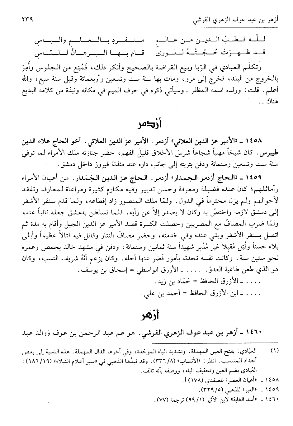 أزدمر الْأَمِير عز الدّين العلائي أَخُو الْحَاج عَلَاء الدّين طيبرس كَانَ شَيخا مهيباً شجاعاً شرس الْأَخْلَاق قَلِيل الْفَهم حضر جنَازَته ملك الْأُمَرَاء لما توفّي سنة سِتّ وَتِسْعين وسِتمِائَة وَدفن بتربته إِلَى جَانب دَاره عِنْد مئذنة فَيْرُوز دَاخل دمشق