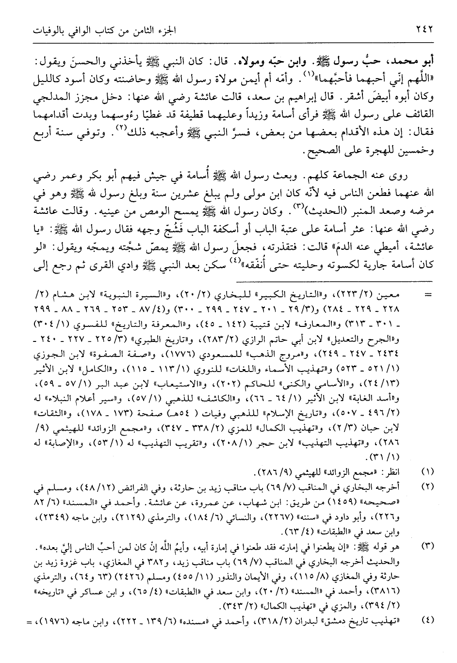 أَبُو مُحَمَّد حِبّ رَسُول الله صلى الله عَلَيْهِ وَسلم وَابْن حبّه ومولاه قَالَ كَانَ النَّبِي صلى الله عَلَيْهِ وسلّم يأخذني وَالْحسن وَيَقُول اللَّهُمَّ إنّي أحبهما فأحبّهما وَأمه أَيمن مولاة رَسُول الله صلى الله عَلَيْهِ وَسلم وحاضنته وَكَانَ أسود كالليل وَكَانَ أَبوهُ أَبيض أشقر قَالَ إِبْرَاهِيم بن سعد قَالَت عَائِشَة رَضِي الله عَنْهَا دخل مجزز المدلجي الْقَائِف على رَسُول الله صلى الله عَلَيْهِ وَسلم فَرَأى أُسَامَة وزيداً وَعَلَيْهِمَا قطيفة قد غطّيا رءوسهما وبدت أقدامهما فَقَالَ إِن هَذِه الْأَقْدَام بَعْضهَا من بعض فسرّ النَّبِي صلى الله عَلَيْهِ وَسلم وَأَعْجَبهُ ذَلِك وَتُوفِّي سنة أَربع وَخمسين لِلْهِجْرَةِ على الصَّحِيح روى عَنهُ الْجَمَاعَة كلهم وَبعث رَسُول الله صلى الله عَلَيْهِ وَسلم أُسَامَة فِي جَيش فيهم أَبُو بكر وَعمر رَضِي الله عَنْهُمَا فطعن النَّاس فِيهِ لأنّه كَانَ ابْن مولى وَلم يبلغ عشْرين سنة وَبلغ رَسُول الله صلى الله عَلَيْهِ وَهُوَ فِي مَرضه وَصعد الْمِنْبَر الحَدِيث وَكَانَ رَسُول الله صلى الله عَلَيْهِ وَسلم يمسح الومص من عَيْنَيْهِ وَقَالَت عَائِشَة رَضِي الله عَنْهَا عثر أُسَامَة على عتبَة الْبَاب أَو أُسْكُفَّة الْبَاب فشجّ وَجهه فَقَالَ رَسُول الله صلى الله عَلَيْهِ وَسلم يَا عَائِشَة أميطي عَنهُ الدَّم قَالَت فتقذرته فَجعل رَسُول الله صلى الله عَلَيْهِ وَسلم يمص شجّته ويمجّه وَيَقُول لَو كَانَ أُسَامَة جَارِيَة لكسوته وحليته حَتَّى أنفّقه سكن بعد النَّبِي صلى الله عَلَيْهِ وَسلم وَادي ثمَّ رَجَعَ إِلَى