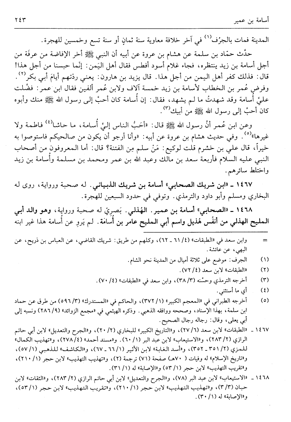 الْمَدِينَة فَمَاتَ بالجرف فِي آخر خلَافَة مُعَاوِيَة سنة ثمانٍ أَو سنة تسع وَخمسين لِلْهِجْرَةِ حدّث حمّاد بن سَلمَة عَن هِشَام بن عُرْوَة عَن أَبِيه أَن النَّبِي صلى الله عَلَيْهِ وَسلم أخر الْإِفَاضَة من عَرَفَة من أجل أُسَامَة بن زيد ينتظره فجَاء غُلَام أسود أفطس فَقَالَ أهل الْيمن إنّما حبسنا من أجل هَذَا قَالَ فَلذَلِك كفر أهل الْيمن من أجل هَذَا قَالَ يزِيد بن هَارُون يَعْنِي ردّتهم أَيَّام أبي بكر وَفرض عمر ابْن الْخطاب لأسامة بن زيد خَمْسَة آلَاف وَلَا بن عمر أَلفَيْنِ فَقَالَ ابْن عمر فضّلت علّي أُسَامَة وَقد شهِدت مَا لم يشْهد فَقَالَ إِن أُسَامَة كَانَ أحبّ إِلَى رَسُول الله صلى الله عَلَيْهِ وَسلم مِنْك وَأَبوهُ كَانَ أحبّ إِلَى رَسُول الله صلى الله عَلَيْهِ وَسلم من أَبِيك وَعَن ابْن عمر أَن رَسُول الله صلى الله عَلَيْهِ وَسلم قَالَ أحبّ النَّاس إليّ أُسَامَة مَا حاشا فَاطِمَة وَلَا غَيرهَا وَفِي حَدِيث هِشَام بن عُرْوَة عَن أَبِيه وَأَنا أَرْجُو أَن يكون من صالحيكم فَاسْتَوْصُوا بِهِ خيرا)