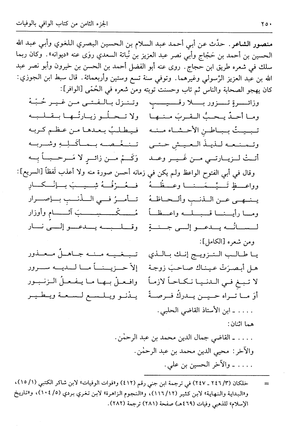 مَنْصُور الشَّاعِر حدّث عَن أبي أَحْمد عبد السَّلَام بن الْحُسَيْن الْبَصْرِيّ اللّغَوِيّ وَأبي عبد الله الْحُسَيْن بن أَحْمد بن حجّاج وَأبي نصر عبد الْعَزِيز بن نباتة السَّعْدِيّ روى عَنهُ ديوانه وَكَانَ رُبمَا سلك فِي شعره طَرِيق ابْن حجاج روى عَنهُ أَبُو الْفضل أَحْمد بن الْحسن بن خيرون وَأَبُو نصر عبد الله بن عبد الْعَزِيز الرَّسولي وَغَيرهمَا وَتُوفِّي سنة تسع وَسِتِّينَ وَأَرْبَعمِائَة قَالَ سبط ابْن الْجَوْزِيّ كَانَ يهجو الصَّحَابَة وَالنَّاس ثمَّ تَابَ وَحسنت تَوْبَته وَمن شعره فِي الحمّى