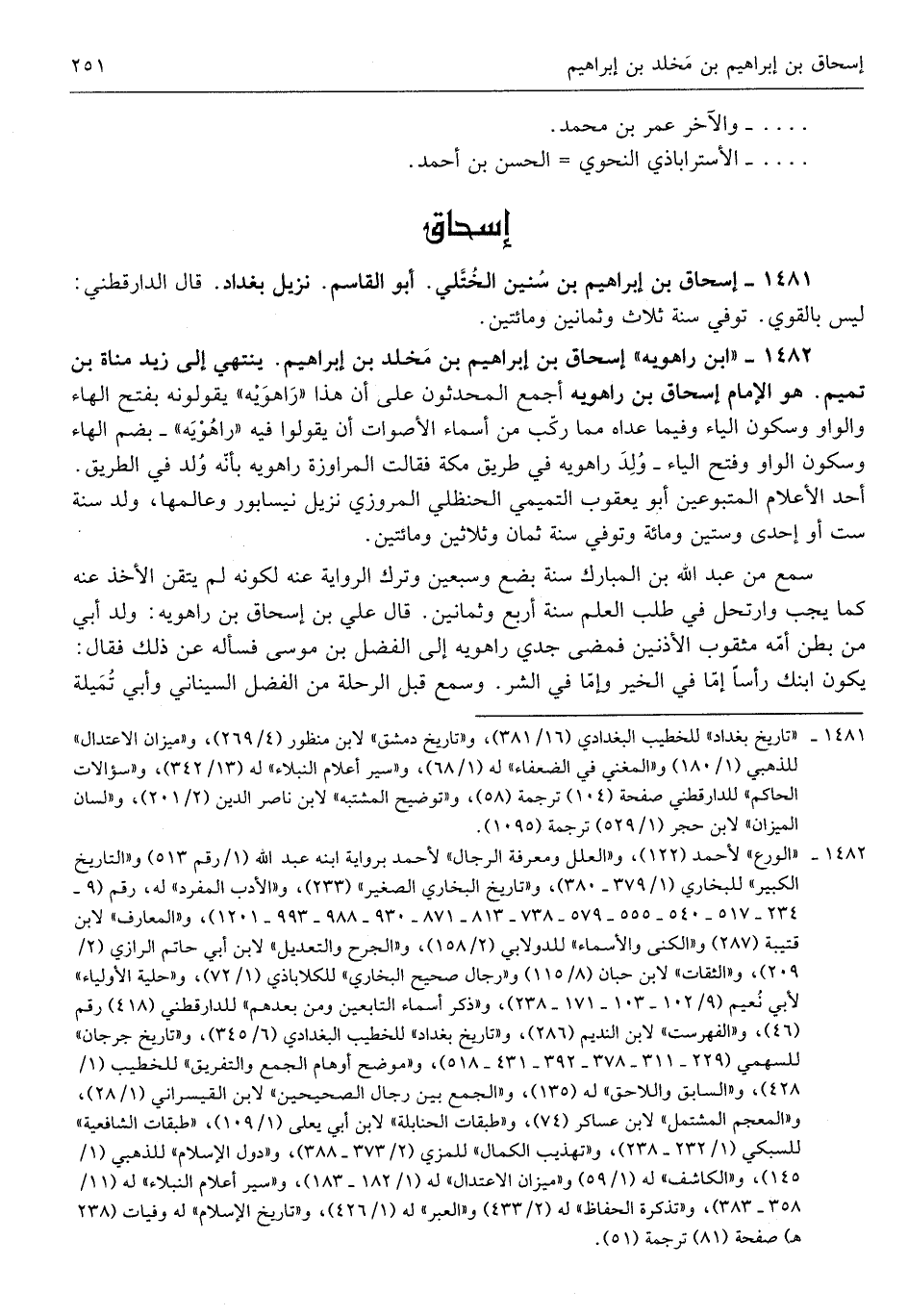 إِسْحَاق بن إِبْرَاهِيم بن مخلد بن إِبْرَاهِيم يَنْتَهِي إِلَى زيد مَنَاة بن تَمِيم هُوَ الإِمَام إِسْحَاق بن رَاهَوَيْه أجمع المحدثون على أَن هَذَا رَاهَوَيْه يَقُولُونَهُ بِفَتْح الْهَاء وَالْوَاو وَسُكُون الْيَاء وَفِيمَا عداهُ مِمَّا ركّب من أَسمَاء الْأَصْوَات أَن يَقُولُوا فِيهِ رَاهَوَيْه بِضَم الْهَاء وَسُكُون الْوَاو وَفتح الْيَاء ولد رَاهَوَيْه فِي طَرِيق مَكَّة فَقَالَت المراوزة رَاهَوَيْه بأنّه ولد فِي الطَّرِيق أحد الْأَعْلَام المتبوعين أَبُو يَعْقُوب التَّمِيمِي الْحَنْظَلِي الْمروزِي نزيل نيسابور وعالمها ولد سنة سِتّ أَو إِحْدَى وَسِتِّينَ وَمِائَة وَتُوفِّي سنة ثَمَان وَثَلَاثِينَ وَمِائَتَيْنِ سمع من عبد الله بن الْمُبَارك سنة بضع وَسبعين وَترك الرِّوَايَة عَنهُ لكَونه لم يتقن الْأَخْذ عَنهُ كَمَا يجب وارتحل فِي طلب الْعلم سنة أَربع وَثَمَانِينَ قَالَ عَليّ بن إِسْحَاق بن رَاهَوَيْه ولد أبي من بطن أمّه مثقوب الْأُذُنَيْنِ فَمضى جدي رَاهَوَيْه إِلَى الْفضل بن مُوسَى فَسَأَلَهُ عَن ذَلِك فَقَالَ يمون ابْنك رَأْسا إمّا فِي الْخَيْر وإمّا فِي الشَّرّ وَسمع قبل الرحلة من الْفضل السينَانِي وَأبي تُمَيْلة