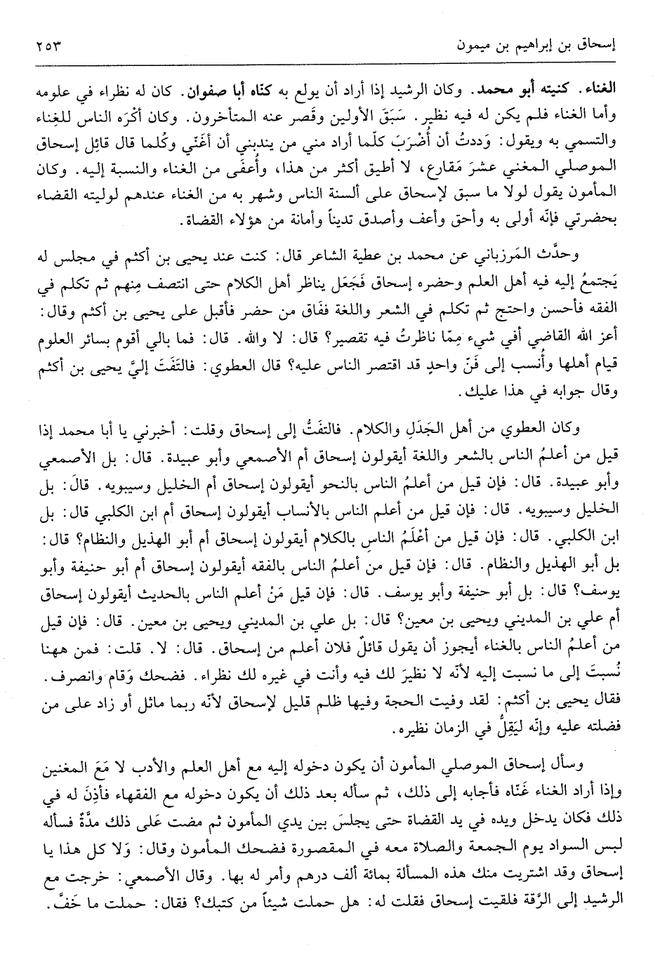 الْغناء كنيته أَبُو مُحَمَّد وَكَانَ الرشيد إِذا أَرَادَ أَن يولع بِهِ كنّاه أَبَا صَفْوَان كَانَ لَهُ فِي علومه وَأما الْغناء فَلم يكن لَهُ فِيهِ نَظِير سبق الْأَوَّلين وَقصر عَنهُ الْمُتَأَخّرُونَ وَكَانَ أكره النَّاس للغناء بِهِ وَيَقُول وددت أَن أضْرب كلّما أَرَادَ مني يندبني أَن أغنّي وَكلما قَالَ قَائِل إِسْحَاق الْموصِلِي الْمُغنِي عشر مقارع لَا أُطِيق أَكثر من هَذَا وأعفى من الْغناء وَالنِّسْبَة إِلَيْهِ وَكَانَ الْمَأْمُون يَقُول لَوْلَا مَا سبق لإسحاق على أَلْسِنَة النَّاس وَشهر بِهِ من الْغناء عِنْدهم لوليته الْقَضَاء بحضرتي فإنّه أولى بِهِ وأحق وأعف وأصدق تديناً وَأَمَانَة من هَؤُلَاءِ الْقُضَاة وحدّث المرزباني عَن مُحَمَّد بن عَطِيَّة الشَّاعِر قَالَ كنت عِنْد يحيى بن أَكْثَم فِي مجْلِس لَهُ يجْتَمع إِلَيْهِ فِيهِ أهل الْعلم وحضره إِسْحَاق فَجعل يناظر أهل الْكَلَام حَتَّى انتصف مِنْهُم ثمَّ تكلم فِي الْفِقْه فَأحْسن وَاحْتج ثمَّ تكلم فِي الشّعْر واللغة ففاق من حضر فَأقبل على يحيى بن أَكْثَم وَقَالَ أعز الله القَاضِي أَفِي شَيْء ممّا ناظرت فِيهِ تَقْصِير قَالَ لَا وَالله قَالَ فَمَا بالي أقوم بِسَائِر الْعُلُوم قيام أَهلهَا وأنسب إِلَى فنّ واحدٍ قد)