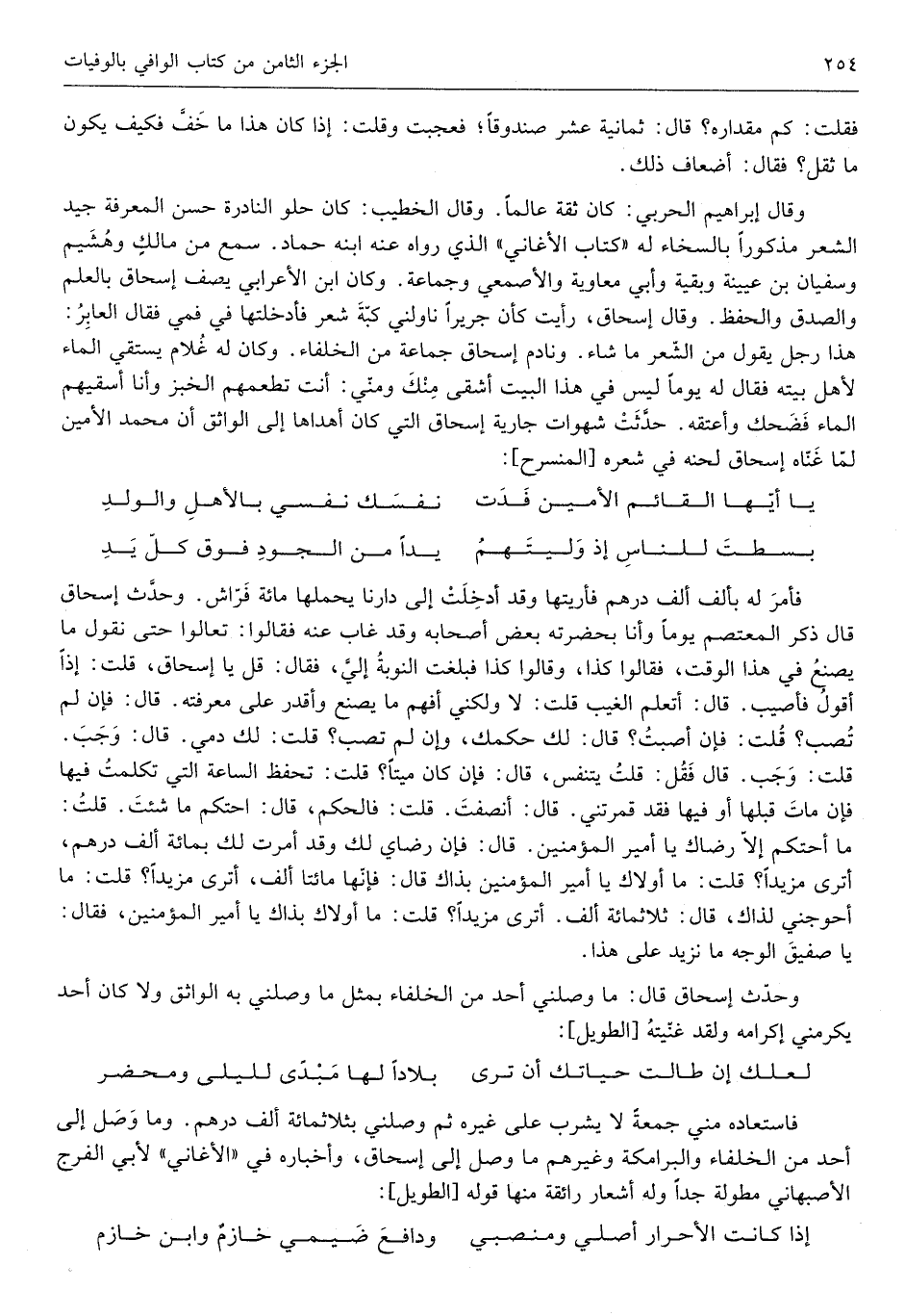 وَمَا وصل إِلَى أحد من الْخُلَفَاء والبرامكة وَغَيرهم مَا وصل إِلَى إِسْحَاق وأخباره فِي الأغاني لأبي الْفرج الْأَصْبَهَانِيّ مُطَوَّلَة جدا وَله أشعار رائقة مِنْهَا قَوْله