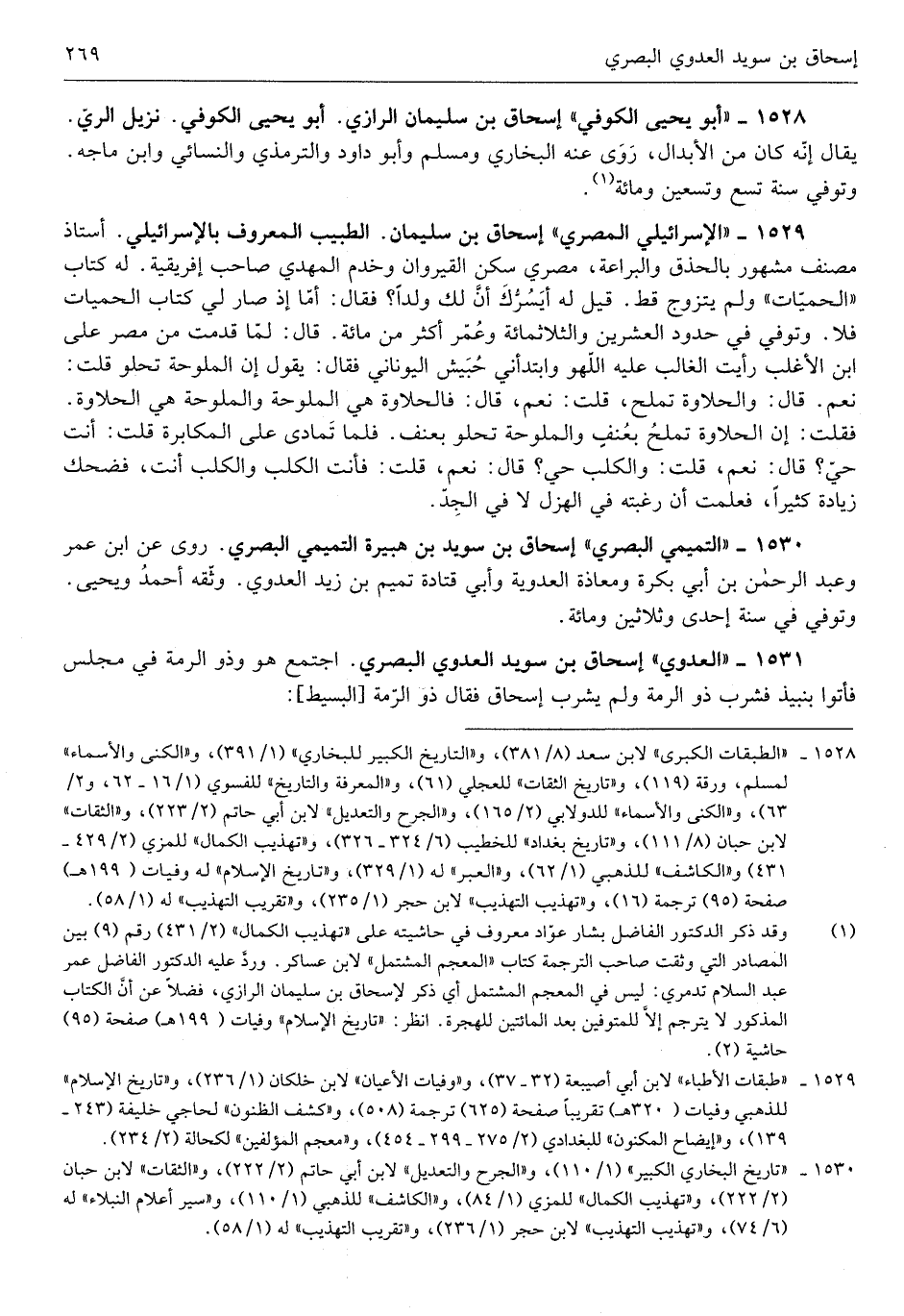 إِسْحَاق بن سُلَيْمَان الطَّبِيب الْمَعْرُوف بالإسرائيلي أستاذ مُصَنف مَشْهُور بالحذق والبراعة مصري سكن القيروان وخدم الْمهْدي صَاحب إفريقية لَهُ كتاب الحميات وَلم يتَزَوَّج قطّ قيل لَهُ أَيَسُرُّك أنّ لَك ولدا فَقَالَ أمّا إِذْ صَار لي كتاب الحميات فَلَا وَتُوفِّي فِي حُدُود الْعشْرين والثلاثمائة وعمّر أَكثر من مائَة قَالَ لمّا قدمت من مصر على ابْن الْأَغْلَب رَأَيْت الْغَالِب عَلَيْهِ اللَّهْو وابتدأني حُبَيْش اليوناني فَقَالَ يَقُول إِن الملوحة تحلو والملوحة هِيَ الْحَلَاوَة فَقلت إِن)