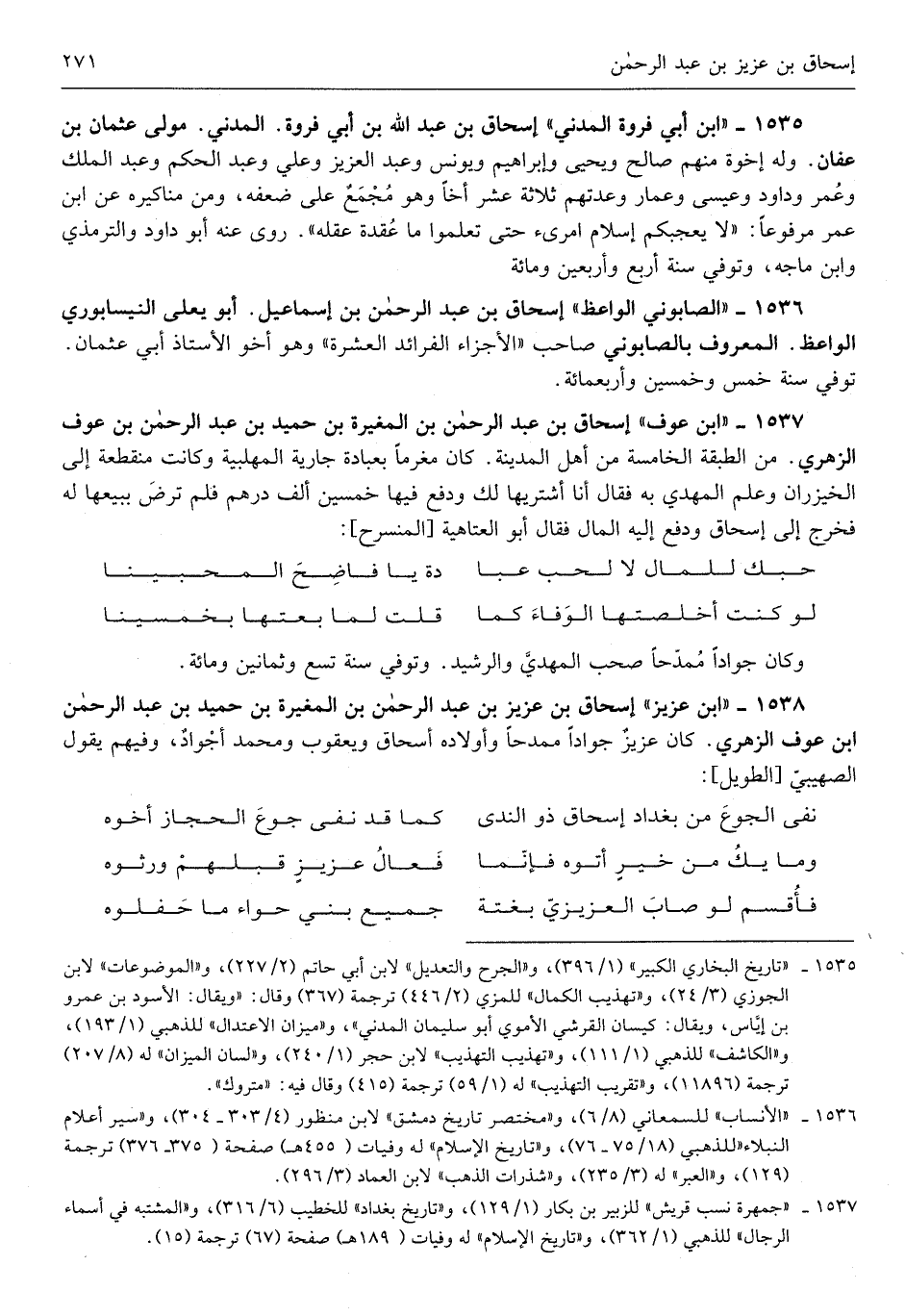 إِسْحَاق بن عبد الرَّحْمَن بن الْمُغيرَة بن حميد بن عبد الرَّحْمَن بن عَوْف الزُّهري من الطَّبَقَة الْخَامِسَة من أهل الْمَدِينَة كَانَ مغرماً بِعبَادة جَارِيَة المهلبية وَكَانَت مُنْقَطِعَة إِلَى الخيزران وَعلم)