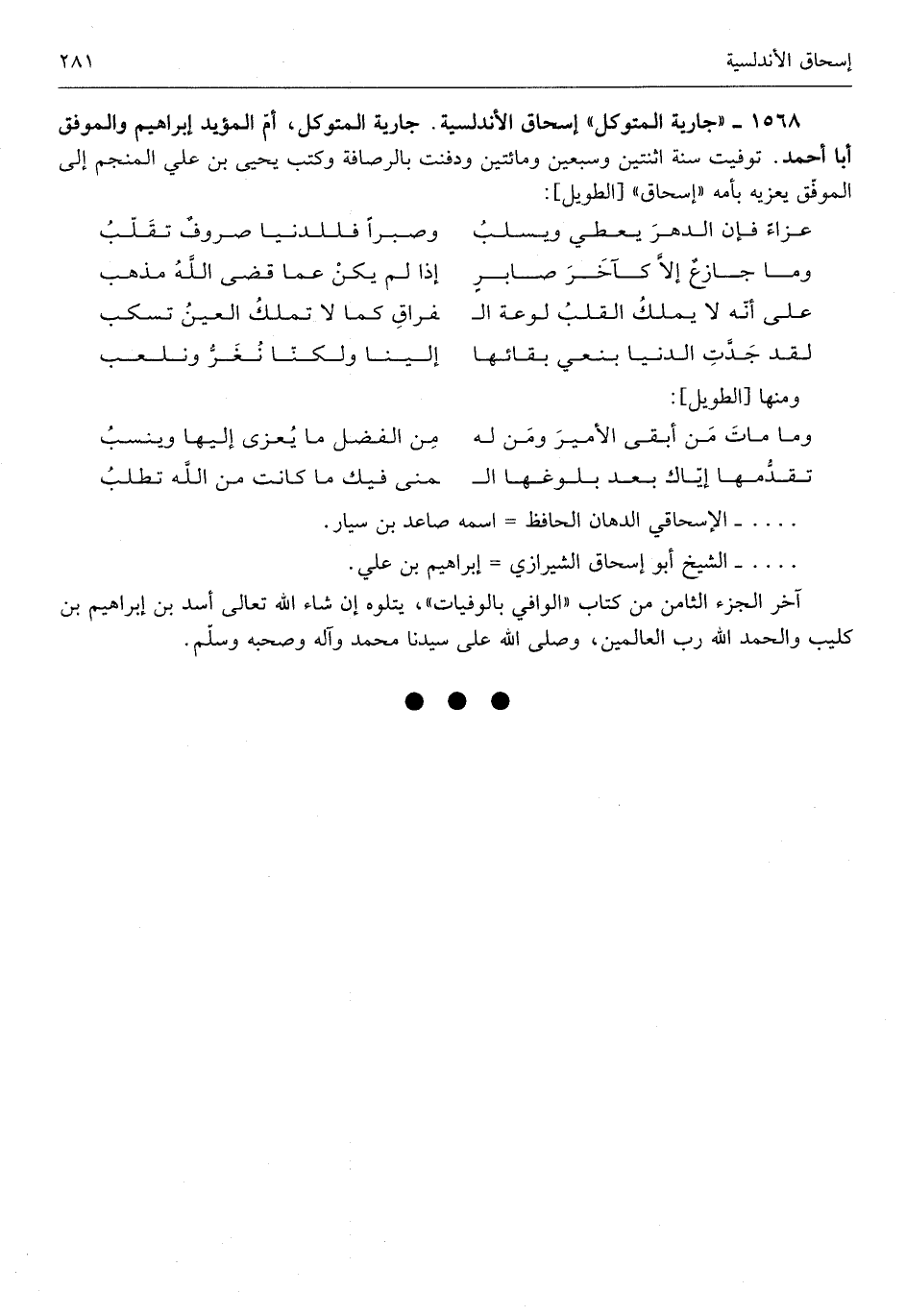 آخر الْجُزْء الثَّامِن من كتاب الوافي بالوفيات يتلوه إِن شَاءَ الله تَعَالَى أَسد بن إِبْرَاهِيم بن كُلَيْب وَالْحَمْد لله رب الْعَالمين وَصلى الله على سيدنَا مُحَمَّد وَآله وَصَحبه وسلّم