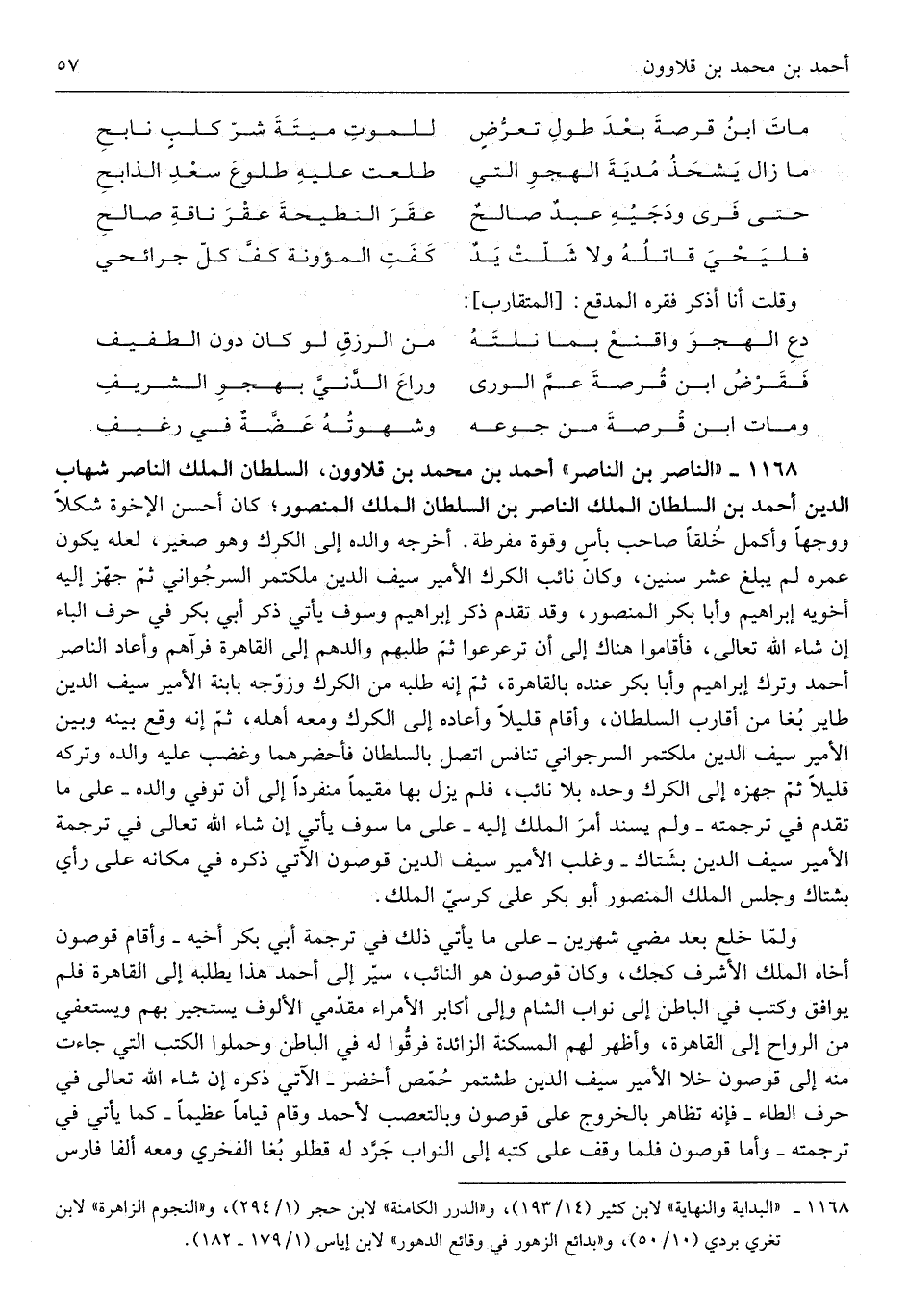 أَحْمد بن مُحَمَّد بن قلاون السُّلْطَان الْملك النَّاصِر شهَاب الدّين أَحْمد ابْن السُّلْطَان الْملك النَّاصِر ابْن السُّلْطَان الْملك الْمَنْصُور كَانَ أحسن الْإِخْوَة شكلاً ووجهاً وأكمل خلقا صَاحب بأسٍ وَقُوَّة مفرطة أخرجه وَالِده إِلَى الكرك وَهُوَ صَغِير لَعَلَّه يكون عمره لم يبلغ عشر سِنِين وَكَانَ نَائِب الكرك الْأَمِير سيف الدّين ملكتمر السرجواني ثمَّ جهّز إِلَيْهِ أَخَوَيْهِ إِبْرَاهِيم وَأَبا بكر الْمَنْصُور وَقد تقدم ذكر إِبْرَاهِيم وسوف يَأْتِي ذكر أبي بكر فِي حرف الْبَاء إِن شَاءَ الله تَعَالَى فأقاموا هُنَالك إِلَى أَن ترعرعوا ثمَّ طَلَبهمْ والدهم إِلَى الْقَاهِرَة فَرَآهُمْ وَأعَاد النَّاصِر أَحْمد وَترك إِبْرَاهِيم وَأَبا بكر عِنْده بِالْقَاهِرَةِ ثمَّ إِنَّه طلبه من الكرك وزوّجه بابنة الْأَمِير سيف الدّين طاير)