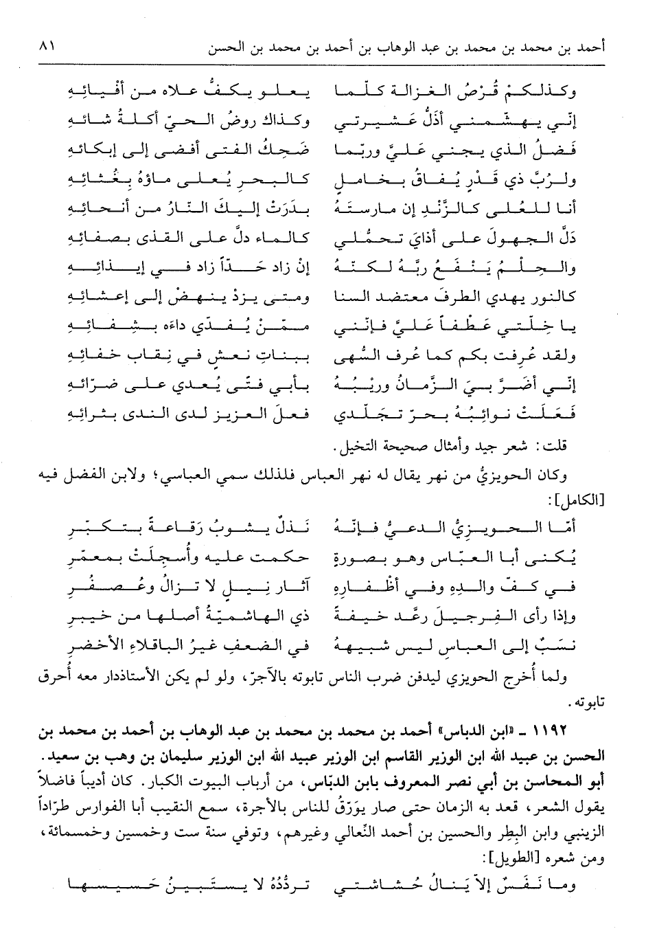 أَحْمد بن مُحَمَّد بن مُحَمَّد بن عبد الْوَهَّاب بن أَحْمد بن مُحَمَّد بن الْحسن بن عبيد الله ابْن الْوَزير الْقَاسِم ابْن الْوَزير عبيد الله ابْن الْوَزير سُلَيْمَان بن وهب بن سعيد أَبُو المحاسن ابْن أبي نصر الْمَعْرُوف بِابْن الدّباس من أَرْبَاب الْبيُوت الْكِبَار كَانَ أديباً فَاضلا يَقُول الشّعْر قعد بِهِ الزَّمَان حَتَّى صَار يورّق للنَّاس بِالْأُجْرَةِ سمع النَّقِيب أَبَا الفوارس طرّاداً الزَّيْنَبِي وَابْن البطر وَالْحُسَيْن بن أَحْمد النّعالي وَغَيرهم وَتُوفِّي سنة سِتّ وَخمسين وَخَمْسمِائة وَمن شعره