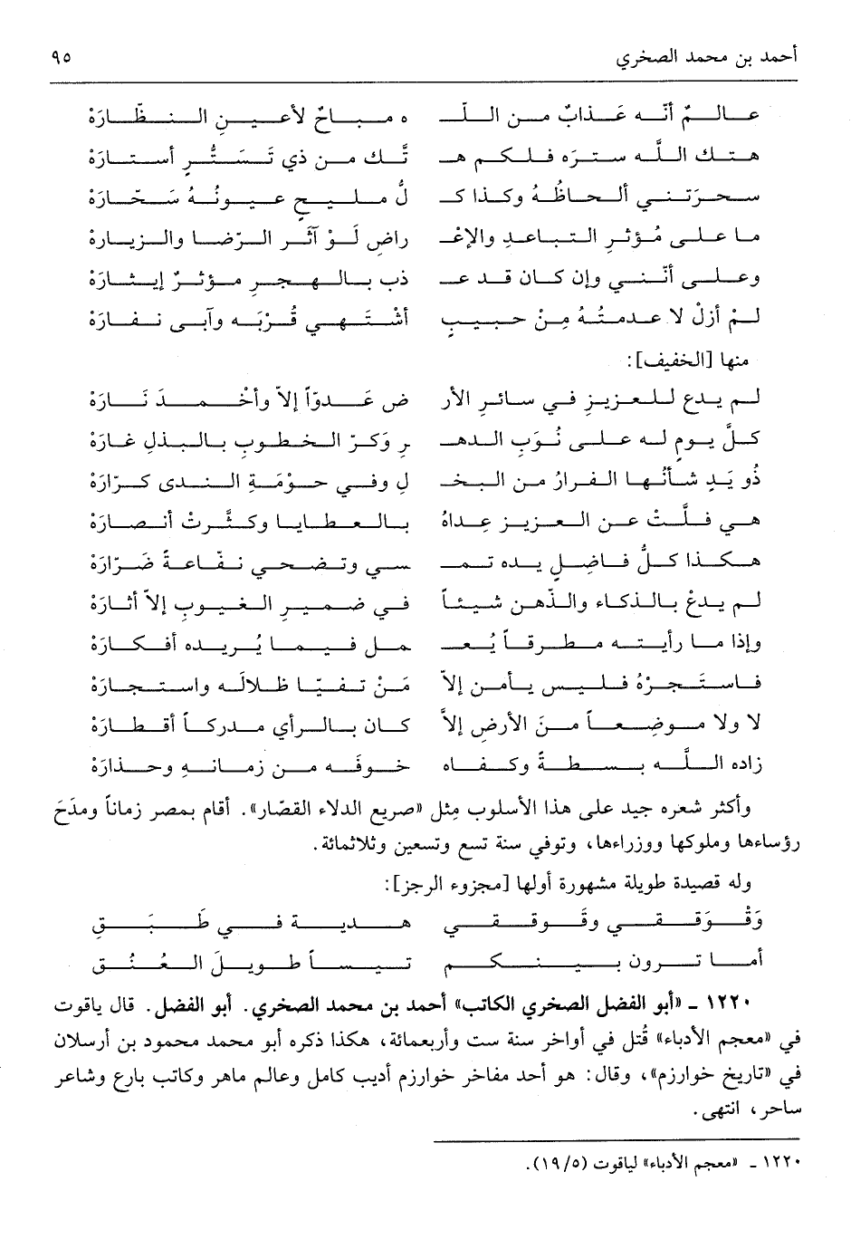 أَحْمد بن مُحَمَّد الصخري أَبُو الْفضل قَالَ ياقوت فِي مُعْجم الأدباء قتل فِي أَوَاخِر سنة سِتّ وَأَرْبَعمِائَة هَكَذَا ذكره أَبُو مُحَمَّد مَحْمُود بن أرسلان فِي تَارِيخ خوارزم وَقَالَ هُوَ أحد مفاخر خوارزم أديب كَامِل وعالم ماهر وَكَاتب بارع وشاعر سَاحر انْتهى
