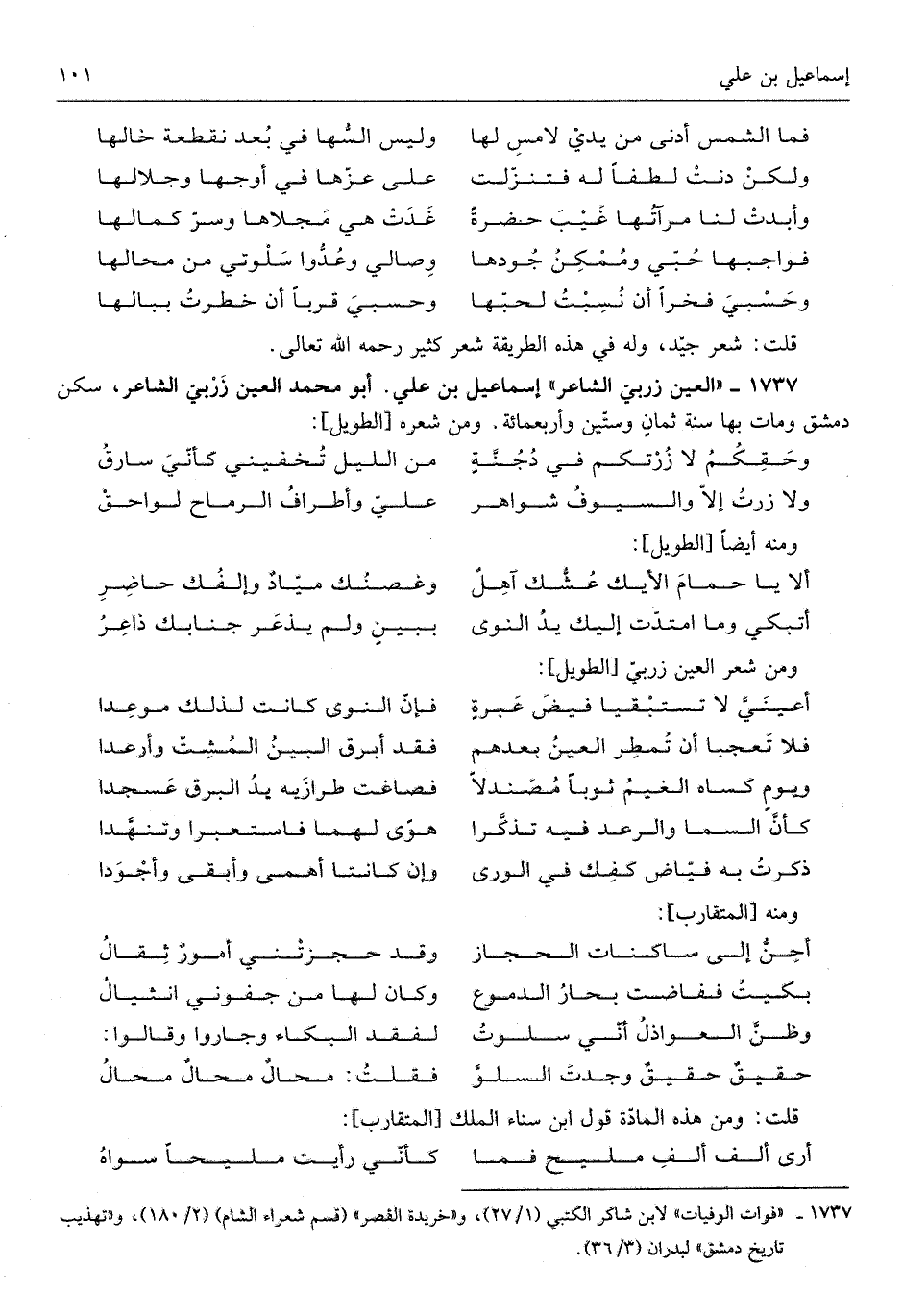 إِسْمَاعِيل بن عَليّ أَبُو مُحَمَّد الْعين زَرْبِي الشَّاعِر سكن دمشق وَمَات بهَا سنة ثمانٍ وَسِتِّينَ وَأَرْبَعمِائَة وَمن شعره من الطَّوِيل