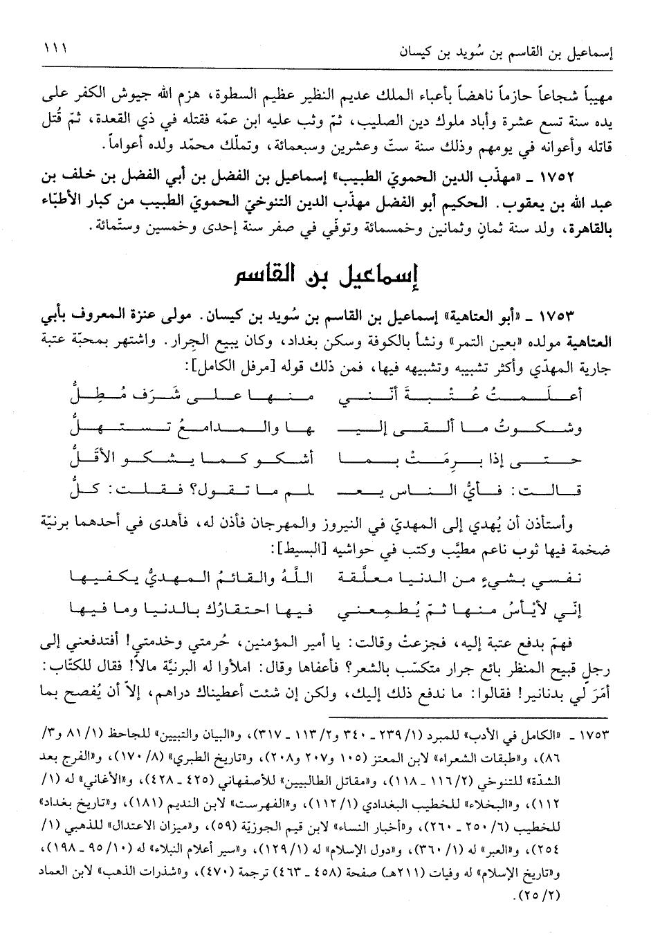 إِسْمَاعِيل بن الْقَاسِم بن سُوَيْد بن كيسَان مولى عنزة الْمَعْرُوف بِأبي الْعَتَاهِيَة مولده بِعَين التَّمْر وَنَشَأ بِالْكُوفَةِ وَسكن بَغْدَاد وَكَانَ يَبِيع الجرار واشتهر بمحبة عتبَة جَارِيَة الْمهْدي وَأكْثر تشبيبه وتشبيهه فِيهَا فَمن ذَلِك قَوْله من الْكَامِل