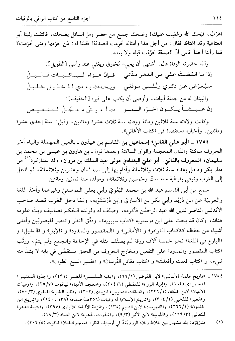 إِسْمَاعِيل بن الْقَاسِم بن عيذون بِالْعينِ الْمُهْملَة وَالْيَاء آخر الْحُرُوف سَاكِنة والذال الْمُعْجَمَة وَالْوَاو الساكنة وَبعدهَا نون بن هَارُون بن عِيسَى بن مُحَمَّد بن سُلَيْمَان الْمَعْرُوف بالقالي أَبُو عَليّ الْبَغْدَادِيّ مولى عبد الْملك بن مَرْوَان ولد بمنازكرد من ديار بكر وَدخل بَغْدَاد سنة ثَلَاث وثلاثمائة وَأقَام بهَا إِلَى سنة ثمانٍ وَعشْرين وثلاثمائة ثمَّ انْتقل إِلَى الغرب وَتُوفِّي بقرطبة سنة سِتّ وَخمسين وثلاثمائة ومولده سنة ثَمَانِينَ وَمِائَتَيْنِ سمع من أبي الْقَاسِم عبد الله بن مُحَمَّد الْبَغَوِيّ وَأبي يعلى الْموصِلِي وَغَيرهمَا وَأخذ اللُّغَة والعربية عَن ابْن دُرَيْد وَأبي بكر ابْن الْأَنْبَارِي وَابْن درسْتوَيْه وَلما دخل الغرب قصد صَاحب الأندلس النَّاصِر لدين الله عبد الرَّحْمَن فَأكْرمه وصنف لَهُ ولولده الحكم تصانيف وَبث علومه هُنَاكَ وَكَانَ قد بحث على ابْن درسْتوَيْه كتاب سِيبَوَيْهٍ ودقق النّظر وانتصر للبصريين وأملى أَشْيَاء من حفظه ك كتاب النَّوَادِر والأمالي والمقصور والممدود وَالْإِبِل وَالْخَيْل والبارع فِي اللُّغَة نَحْو خَمْسَة آلَاف ورقة لم يصنف مثله فِي الْإِحَاطَة وَالْجمع وَلم يتم ورتب كتاب الْمَقْصُور والممدود على التفعيل ومخارج الْحُرُوف من الْحلق مستقصى فِي بَابه لَا يشذ مِنْهُ شَيْء وَكتاب فعلت وأفعلت وَكتاب مقَاتل الفرسان وَتَفْسِير السَّبع الطوَال