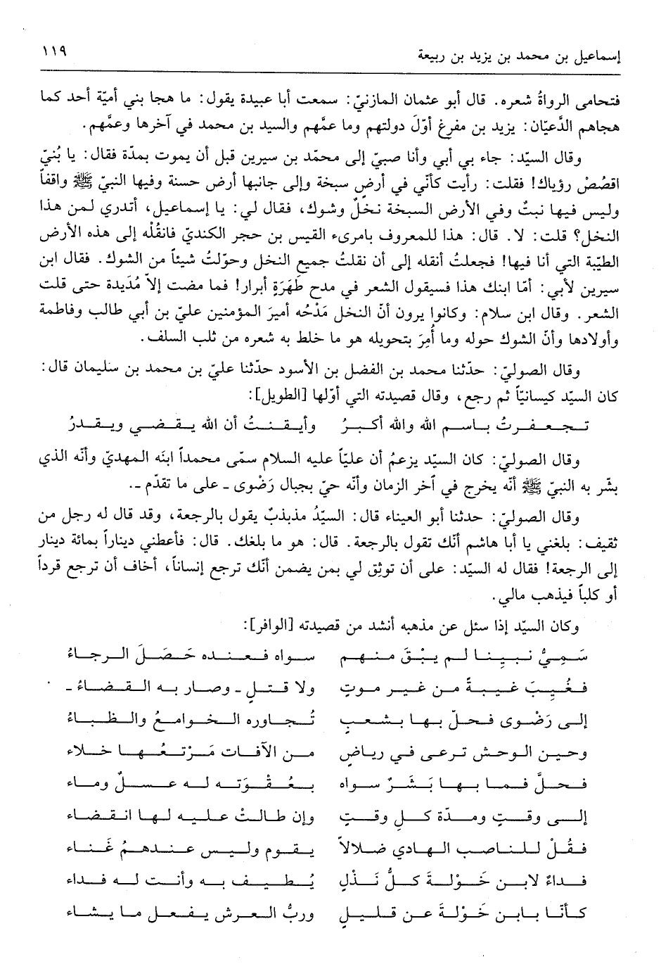صلى الله عَلَيْهِ وَسلم وَاقِفًا وَلَيْسَ فِيهَا نبت وَفِي الأَرْض السبخة نخل وَشَوْك فَقَالَ لي يَا إِسْمَاعِيل أَتَدْرِي لمن هَذَا النّخل قلت لَا قَالَ هَذَا للمعروف بامرئ الْقَيْس بن حجر الْكِنْدِيّ فانقله إِلَى هَذِه الأَرْض الطّيبَة الَّتِي أَنا فِيهَا فَجعلت أنقله إِلَى أَن نقلت جَمِيع النّخل وحولت شَيْئا من الشوك فَقَالَ ابْن سِيرِين لأبي أما ابْنك هَذَا فسيقول الشّعْر فِي مدح طهرةٍ أبرار فَمَا مَضَت إِلَّا مديدة حَتَّى قلت الشّعْر وَقَالَ ابْن سَلام وَكَانُوا يرَوْنَ أَن النّخل مدحه أَمِير الْمُؤمنِينَ عَليّ ابْن أبي طَالب وَفَاطِمَة وَأَوْلَادهَا وَأَن الشوك حوله وَمَا أَمر بتحويله هُوَ مَا خلط بِهِ شعره من ثلب السّلف وَقَالَ الصولي حَدثنَا مُحَمَّد بن الْفضل بن الْأسود حَدثنَا عَليّ بن مُحَمَّد بن سُلَيْمَان قَالَ كَانَ السَّيِّد كيسانياً ثمَّ رَجَعَ وَقَالَ قصيدته الَّتِي أَولهَا من الطَّوِيل