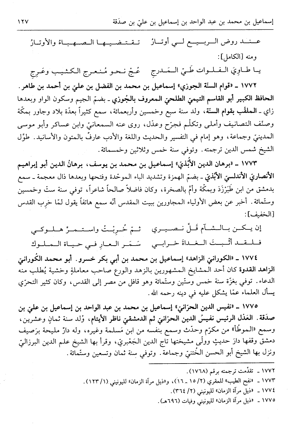 إِسْمَاعِيل بن مُحَمَّد بن عبد الْوَاحِد بن إِسْمَاعِيل بن عَليّ بن صَدَقَة الْعدْل الرئيس نَفِيس الدّين الْحَرَّانِي ثمَّ الدِّمَشْقِي نَاظر الْأَيْتَام ولد سنة ثمانٍ وَعشْرين وَسمع الْمُوَطَّأ من مكرم وَحدث وَسمع بِنَفسِهِ من ابْن مسلمة وَغَيره وَله دَار مليحة برصيف دمشق وَقفهَا دَار حديثٍ وَولى مشيختها تَاج الدّين الجعبري وَقَرَأَ بهَا الشَّيْخ علم الدّين البرزالي وَنزل بهَا الشَّيْخ أَبُو الْحسن الختني وَجَمَاعَة وَتُوفِّي سنة ثَمَان وَتِسْعين وسِتمِائَة