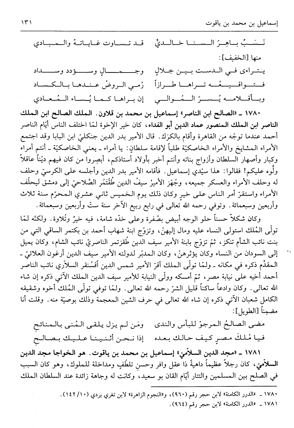 وَتُوفِّي رَحمَه الله تَعَالَى فِي رَابِع ربيع الآخر سنة سِتّ وَأَرْبَعين وَسَبْعمائة وَكَانَ شكلاً حسنا حُلْو الْوَجْه أَبيض بصفرة وعَلى خَدّه شامة فِيهِ خير وتلاوة وَلكنه لما تولى الْملك استولى النِّسَاء عَلَيْهِ وَمَال إلَيْهِنَّ وَتزَوج ابْنة شهَاب أَحْمد بن بكتمر الساقي الَّتِي من بنت نَائِب الشَّام تنكز ثمَّ تزوج بابنة الْأَمِير سيف الدّين طقزتمر الناصري نَائِب الشَّام وَكَانَ يمِيل إِلَى السودَان من النِّسَاء وَكَانَ يؤثرهن وَكَانَ الْمُدبر لدولته الْأَمِير سيف الدّين أرغوني العلائي الْمُقدم ذكره فِي مَكَانَهُ وَلما تولى الْملك أقرّ الْأَمِير شمس الدّين آقسنقر السلاري نَائِب النَّاصِر أَحْمد أَخِيه على نِيَابَة مصر ثمَّ أمْسكهُ وَولى النِّيَابَة للأمير سيف الدّين الْملك الْآتِي ذكره إِن شَاءَ الله تَعَالَى وَكَانَ وادعاً سَاكِنا قَلِيل الشَّرّ رَحمَه الله تَعَالَى وَلما توفّي تولى الْملك أَخُوهُ وشقيقه الْكَامِل شعْبَان الْآتِي ذكره إِن شَاءَ الله تَعَالَى فِي حرف الشين الْمُعْجَمَة وَذَلِكَ بِوَصِيَّة مِنْهُ وَقلت أَنا مضمناً من الطَّوِيل