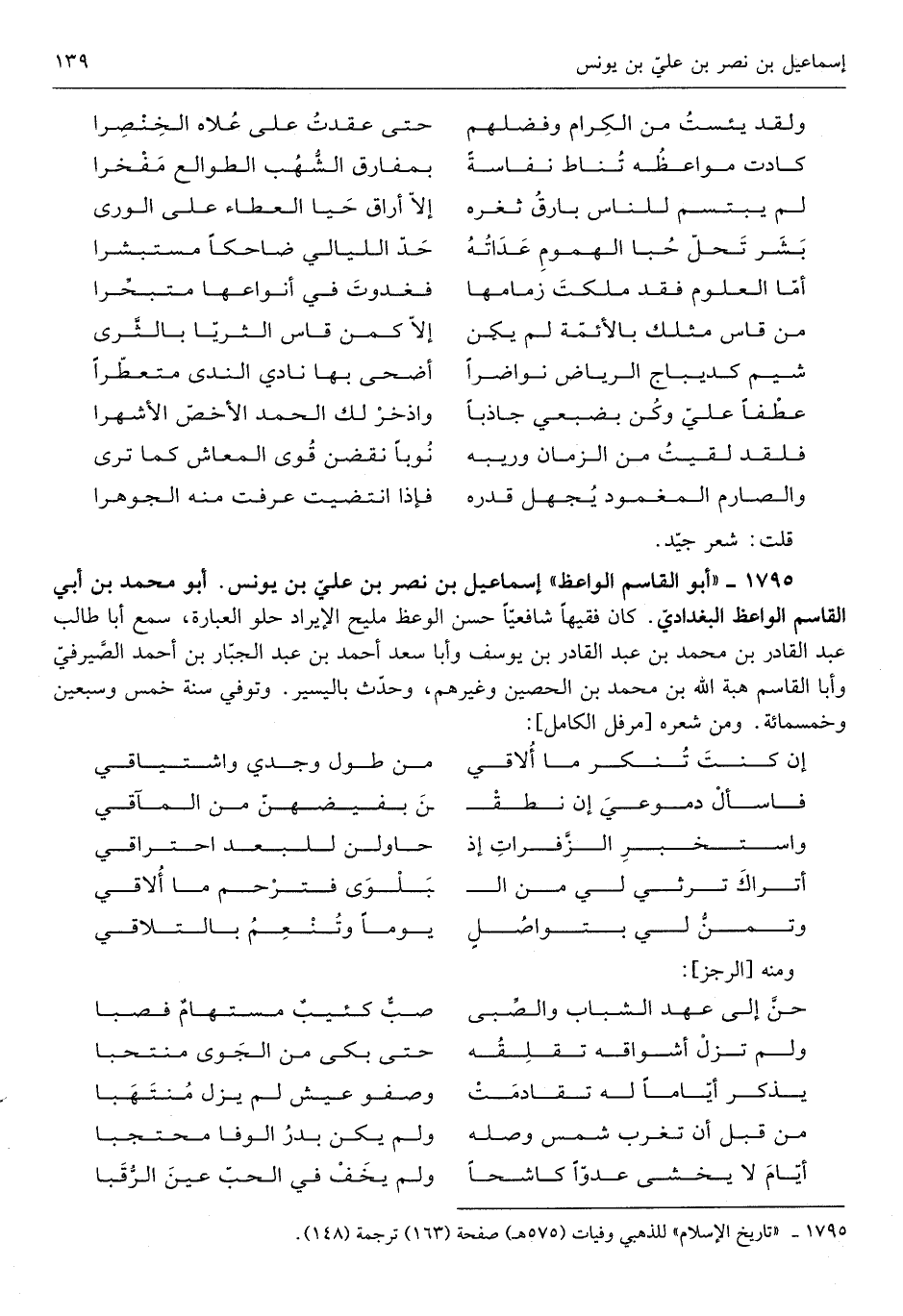 إِسْمَاعِيل بن نصر بن عَليّ بن يُونُس أَبُو مُحَمَّد ابْن أبي الْقَاسِم الْوَاعِظ الْبَغْدَادِيّ كَانَ فَقِيها شافعياً حسن الْوَعْظ مليح الْإِيرَاد حُلْو الْعبارَة سمع أَبَا طَالب عبد الْقَادِر بن مُحَمَّد بن عبد الْقَادِر بن يُوسُف وَأَبا سعد أَحْمد بن عبد الجبّار بن أَحْمد الصّيرفي وَأَبا الْقَاسِم هبة الله بن مُحَمَّد بن الحُصين وَغَيرهم وَحدث باليسير وَتُوفِّي سنة خمس وَسبعين وَخَمْسمِائة وَمن شعره من الْكَامِل المجزوء المرفل