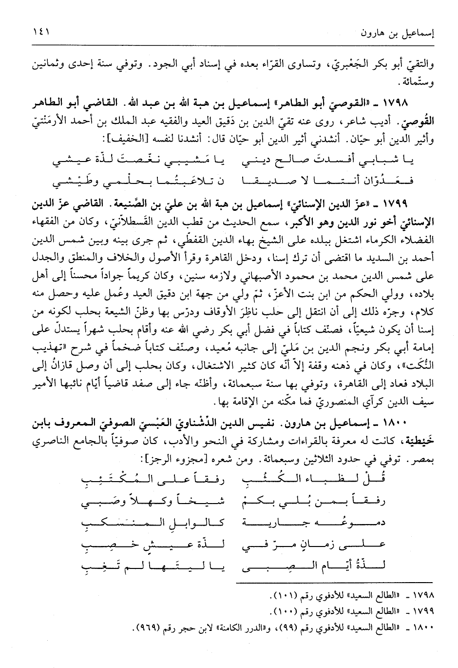 إِسْمَاعِيل بن هَارُون نَفِيس الدّين الدشناوي الْعَبْسِي الصُّوفِي الْمَعْرُوف بِابْن خيطية كَانَت لَهُ معرفَة بالقراآت ومشاركة فِي النَّحْو وَالْأَدب كَانَ صوفياً بالجامع الناصري بِمصْر توفّي فِي حُدُود الثَّلَاثِينَ وَسَبْعمائة وَمن شعره من الرجز
